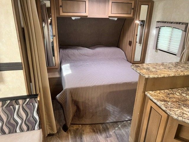 Enjoy a great nights rest on the lift up queen bed in front with wardrobes on both sides of the bed. There is more storage in the overhead cabinets, and you also have space for larger items like blankets, suitcases, and more underneath.