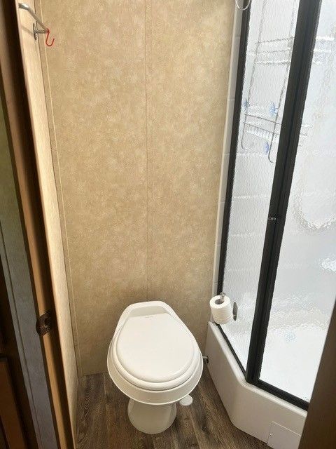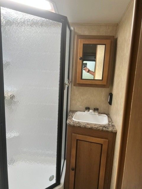 Stepping inside this unit you will find a closet/pantry to your immediate left. There is a bath straight ahead which features an angled shower, toilet, sink, and skylight.