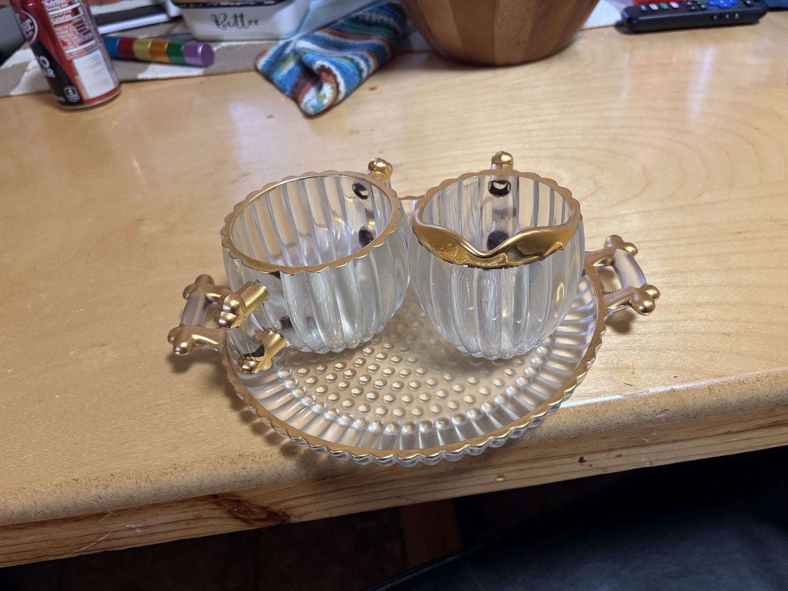 ApplePaycream and sugar bowl in platter clear glass with gold on top and handles