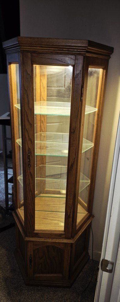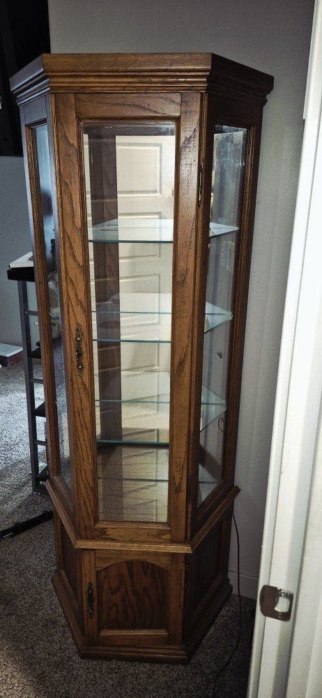 Beautiful well cared for cabinet with 4 glass adjustable height shelves and an option to have a light on inside as well. mirrored back. The bottom area is an enclosed cabinet with a door. There are no chips or cracks in any of the glass (shelves, doors, mirrors)