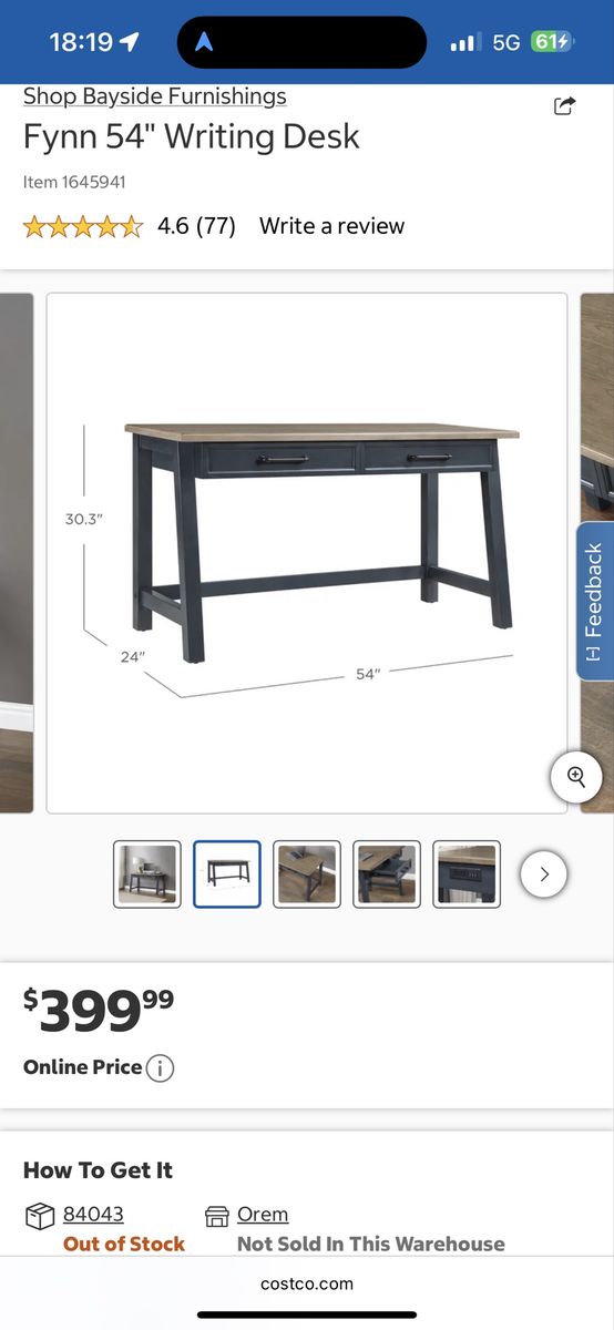 Im selling a Costco Fynn 54" Writing Desk in good condition