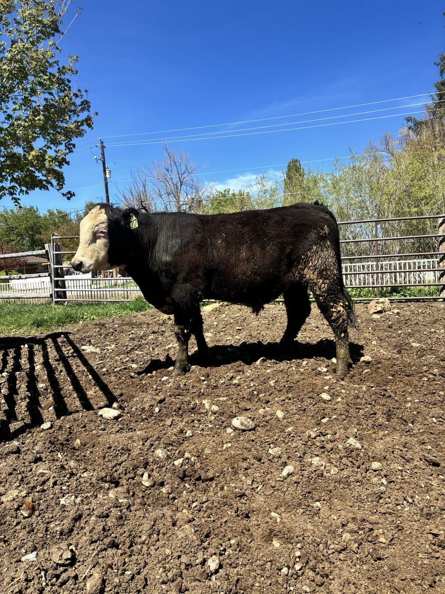He is a F1 black baldy bull our of a non registered black angus cow and a hereford bull. He was an easy coming calf that took off and was very vigorous. He is mostly pigmented on both eyes and moves cleanly and well He comes from a cow family we have had for over 20 yrs that have performed well and raised good calves. His dam is a moderate framed cow that is quite easy to work with. Trich, semen and full reproductive exam was conducted on 3/17/26. He passed the exam without issue with good semen volume, morphology and motility. His scrotal was measured at 34 at just under a year of age.
