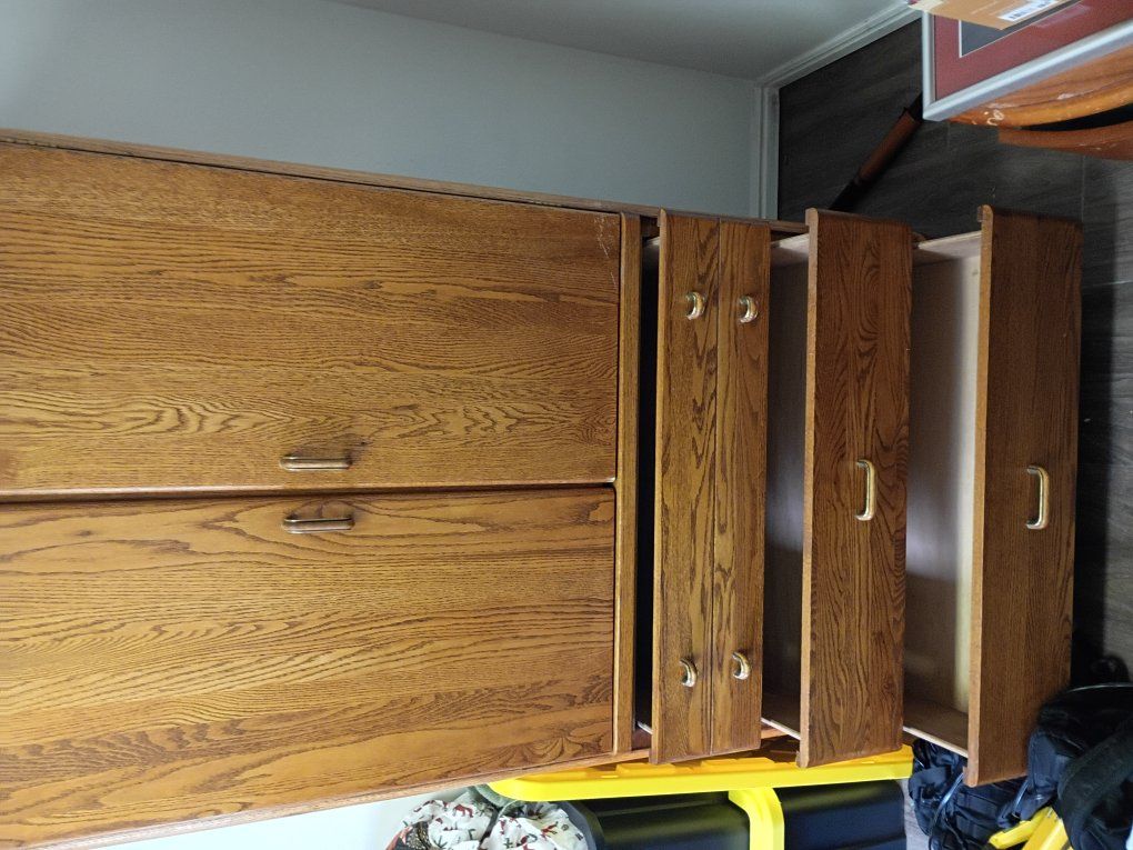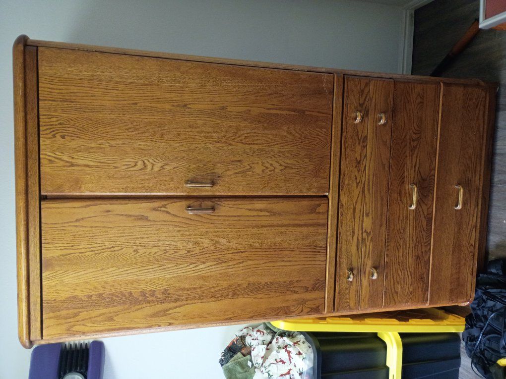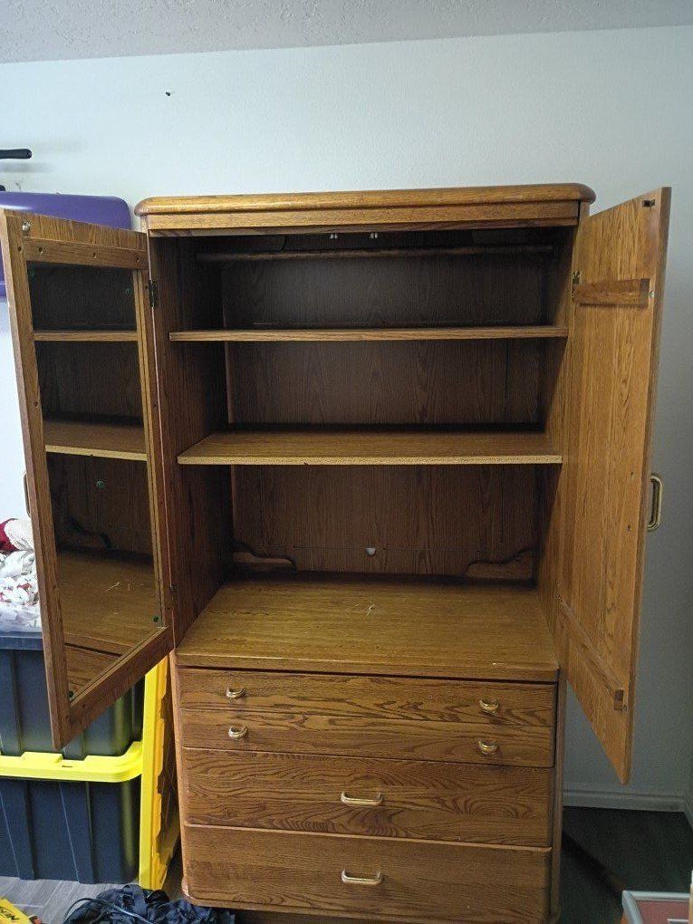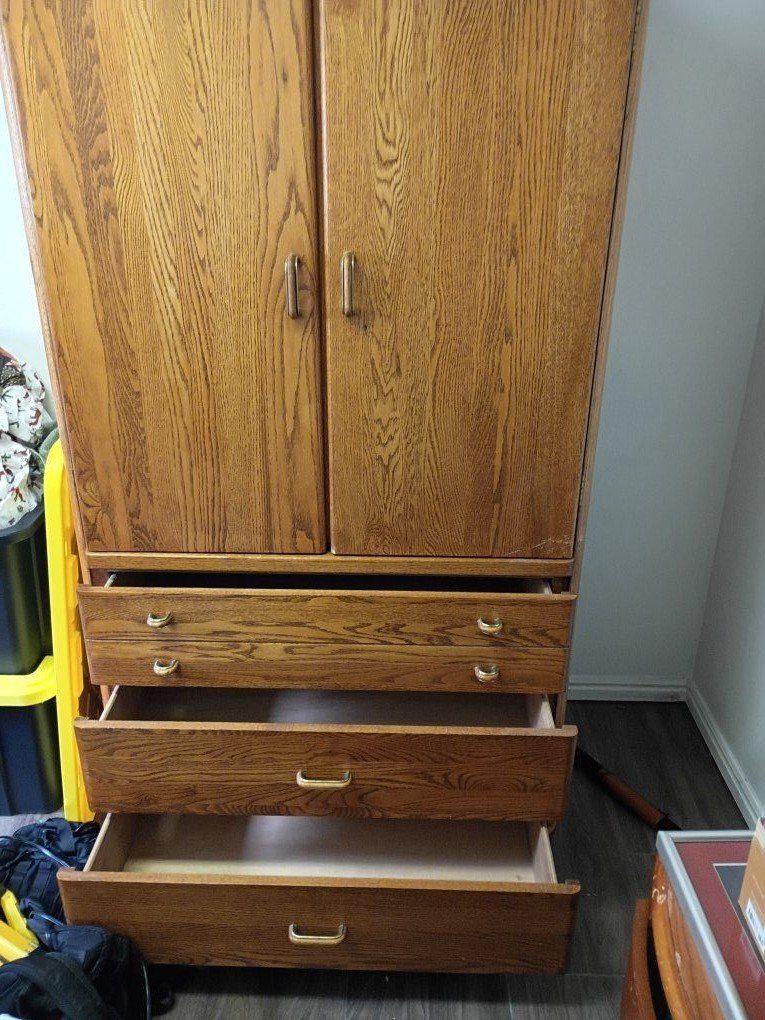 Solid wood cabinet in good condition. Features double doors with interior shelving and a hanging rod—great for clothes, storage, or even a TV/entertainment setup. Includes 3 spacious drawers on the bottom.