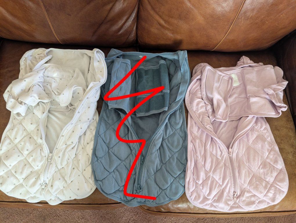 Size small swaddles. for 0-6months. shoulders unsnap for when babies start to roll over and you use it as a sleep sack instead of a swaddle. White and Pink are still available. $30 each or $50 for both.