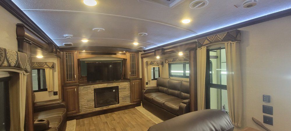 2018 Montana 3730FL Legacy Edition. Front Living room. This Fifth Wheel is in great shape! Perfect for Camping or heading south for the winter. Will sleep 6. The two opposing sofas make queen beds. King bed Master suite. Dual whisper quite ACs, Washer/Dryer combo, 6 slides, solar and generator prep.