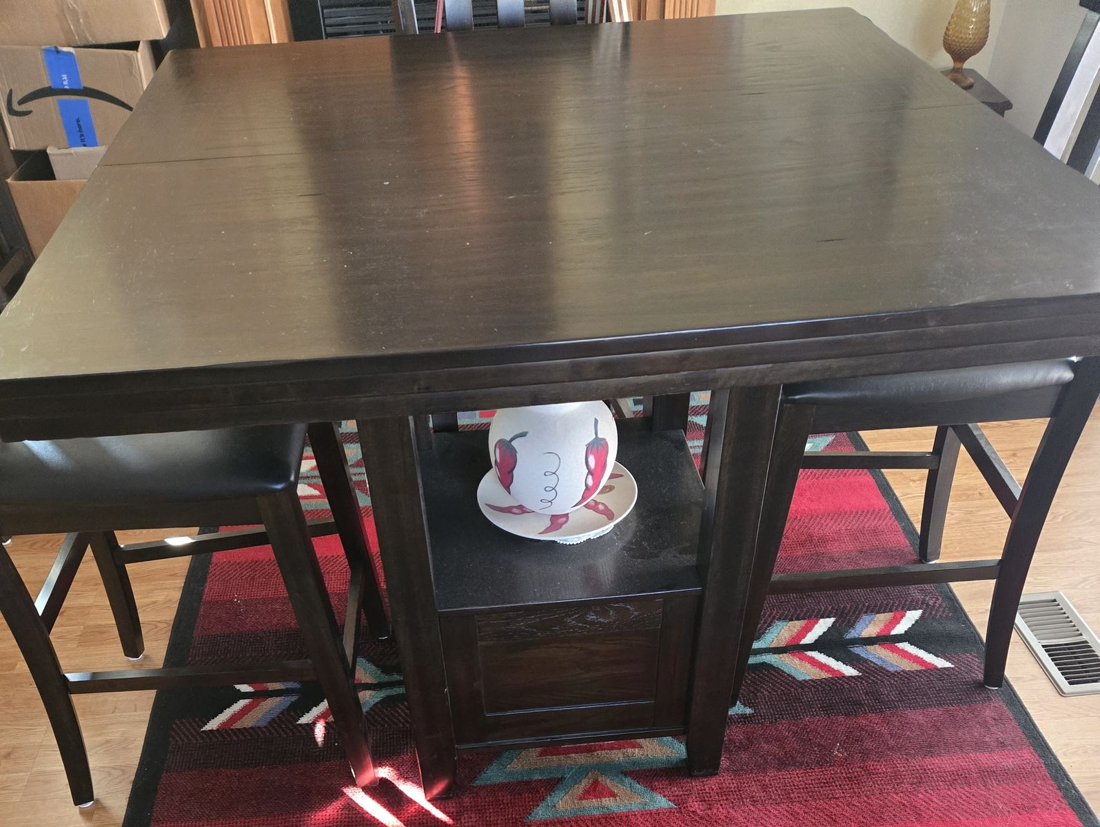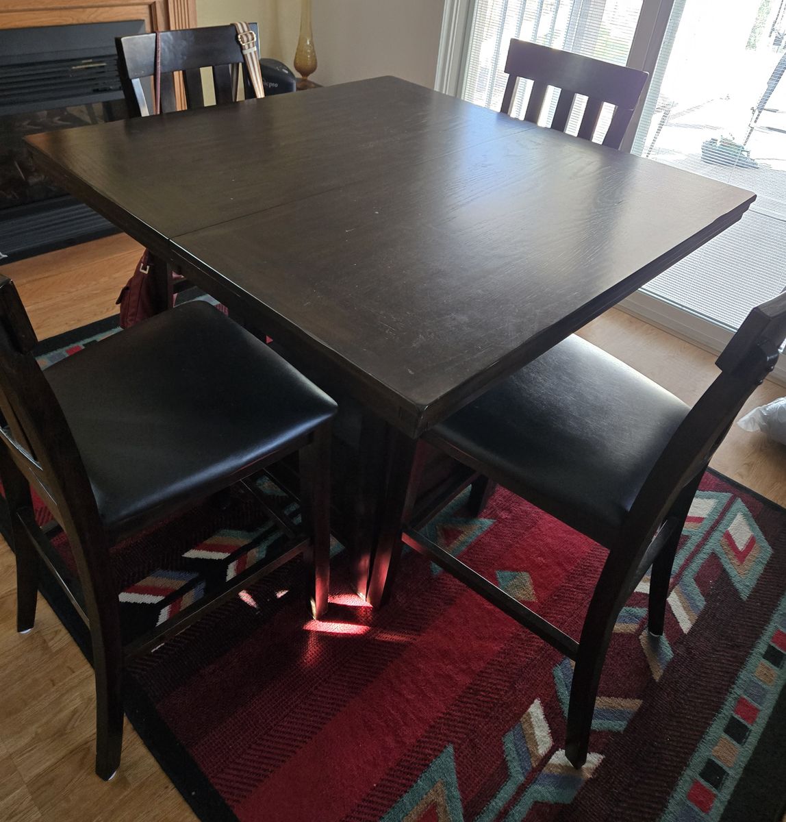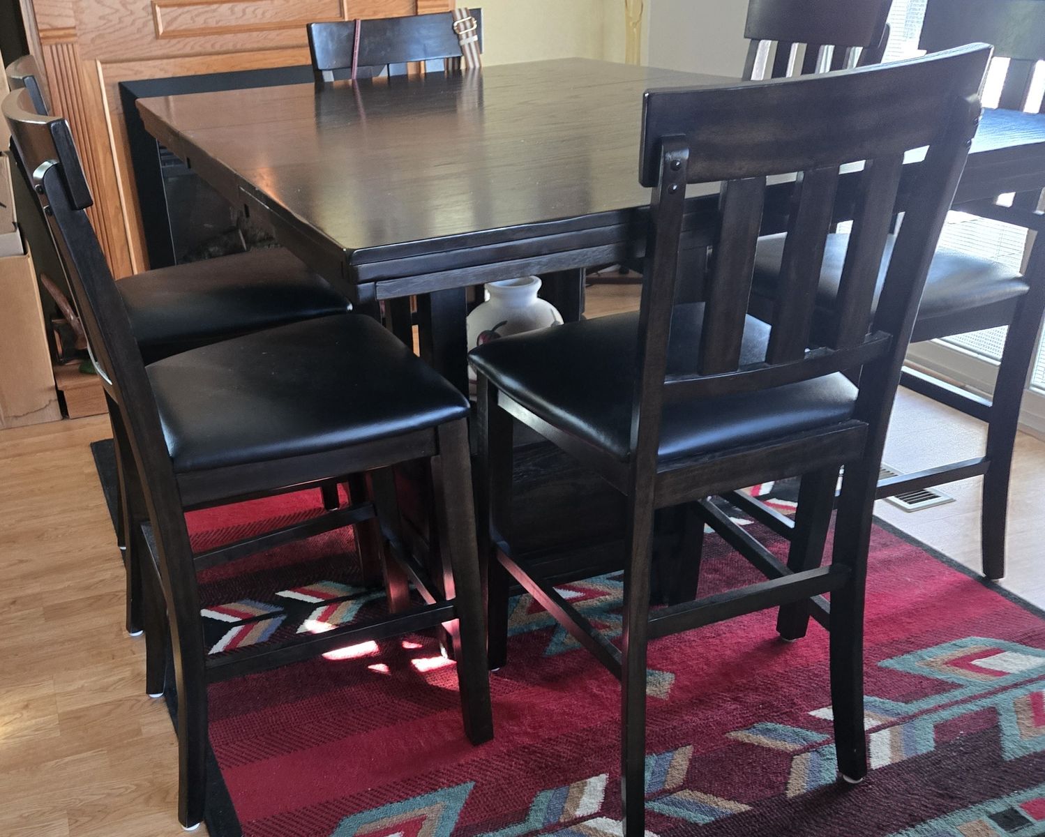 CashApp8 Piece Dinette set. 6 Chairs 1 leaf and the table. Table seats 6, dark wood stain and chairs are padded . It is a counter height (36”) table that is 42” square without the leaf. The table is 42” X 60” with the leaf inserted. All great condition. No scratches or marks. New $1500 at Ashley Furniture Now only $850