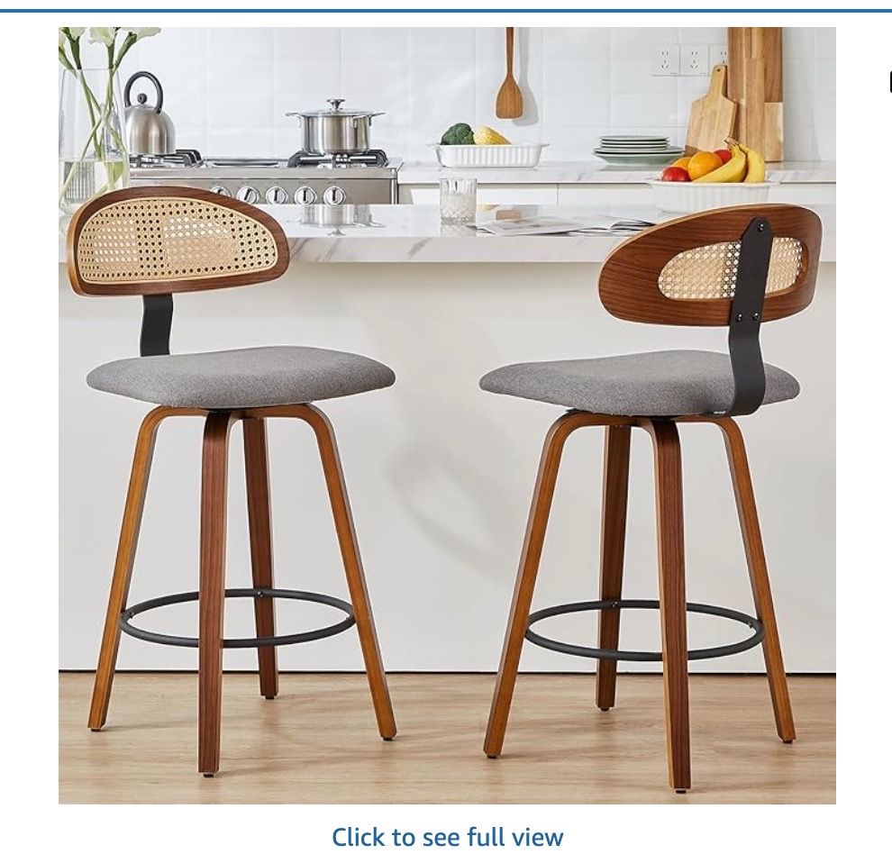 ZelleKinmar’s Swivel Counter Height Bar Stools, 26" Upholstered Seat Barstools with Rattan Back, Bentwood Frame Mid Century Modern Bar Chairs for Kitchen Island, Dining Room Bar Stools(Grey, Set of 4)