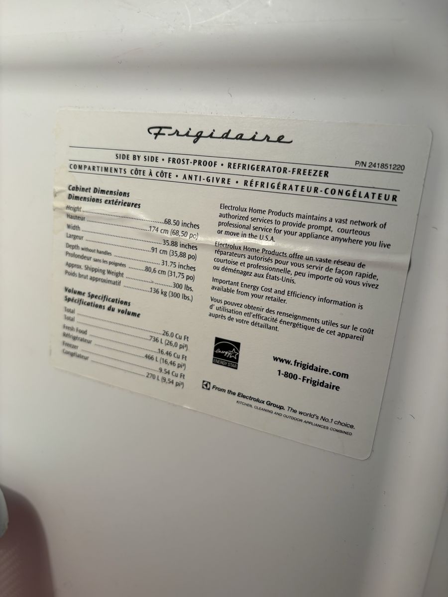 Frigidaire 26 ft.² side-by-side works. Text me at 435-224-1102.