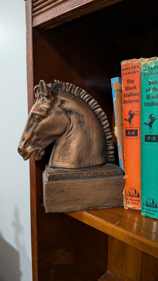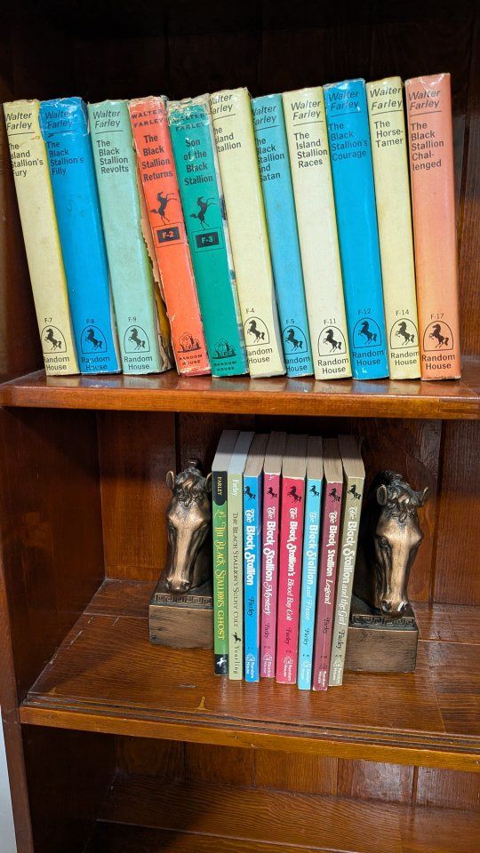 Vintage Black stallion book collection with assorted hard and soft cover books numbers 1, 2, 3, 4, 5, 6, 7, 8, 9, 11, 12, 13, 14, 15, 17, 19. and two additional Black stallion books. collection also includes a set of horsehead bookends from Universal Statuary Corp.