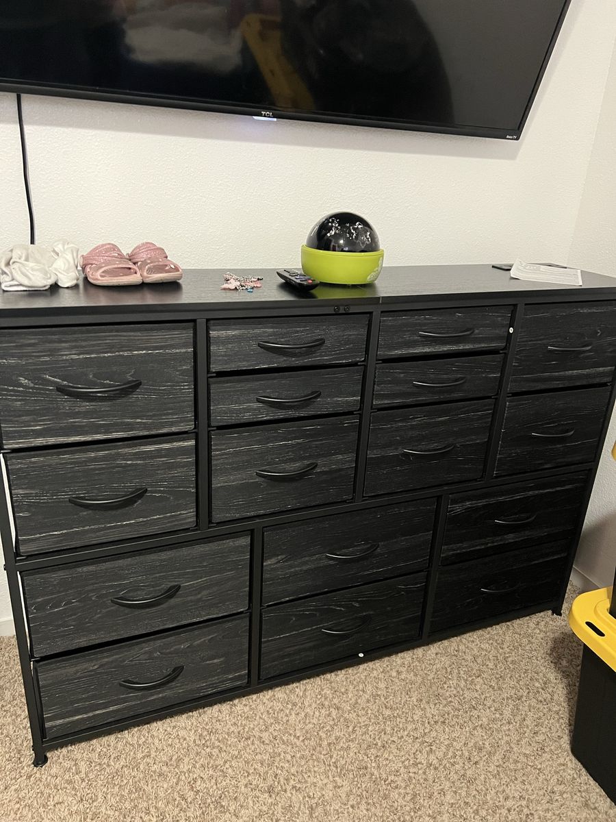 Romorgniz Dresser for Bedroom with 16 Fabric Drawers Long Dresser with Charging Station TV Stand for 60" TV Dressers & Chest of Drawers for Bedroom, Living Room, Black. I have two of them, $135.00 each or the asking price for both. The one in the picture I’m keeping the other two just need the drawers installed.