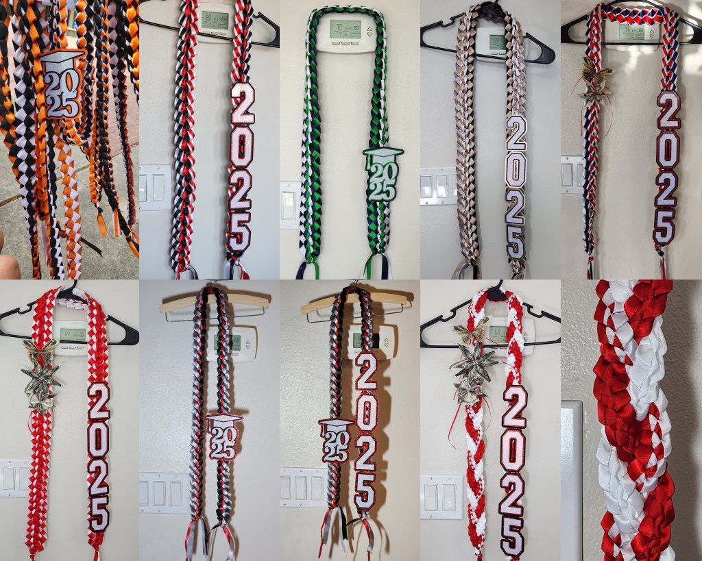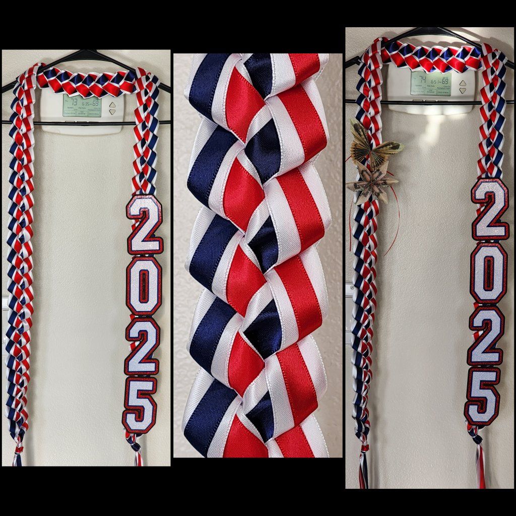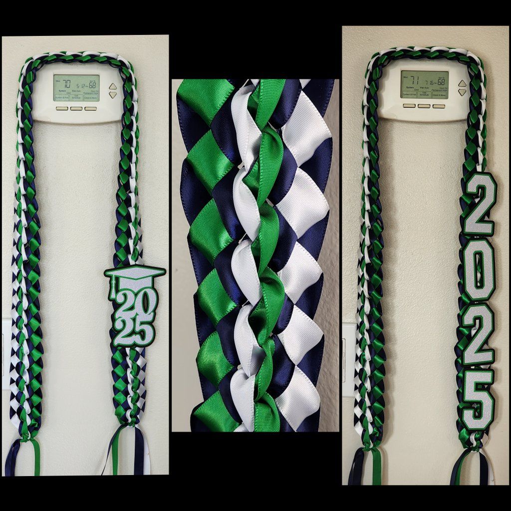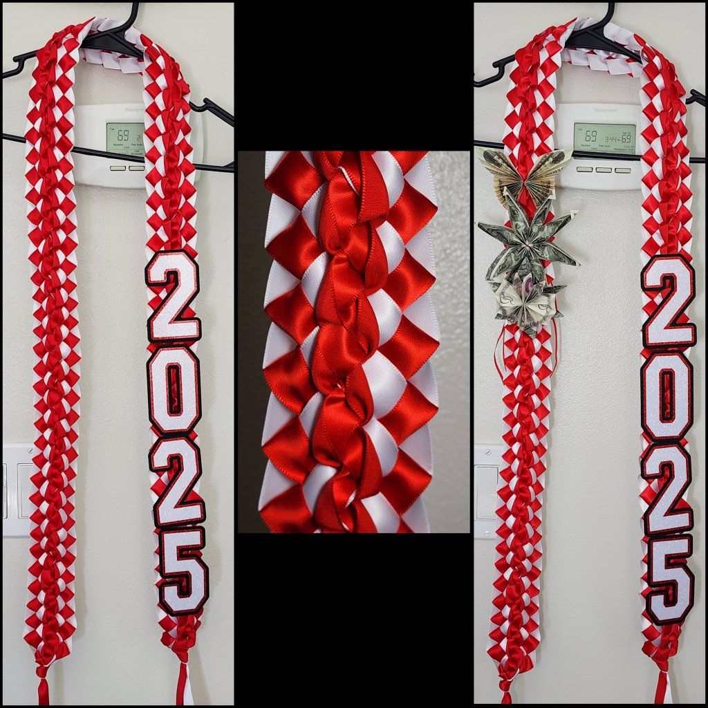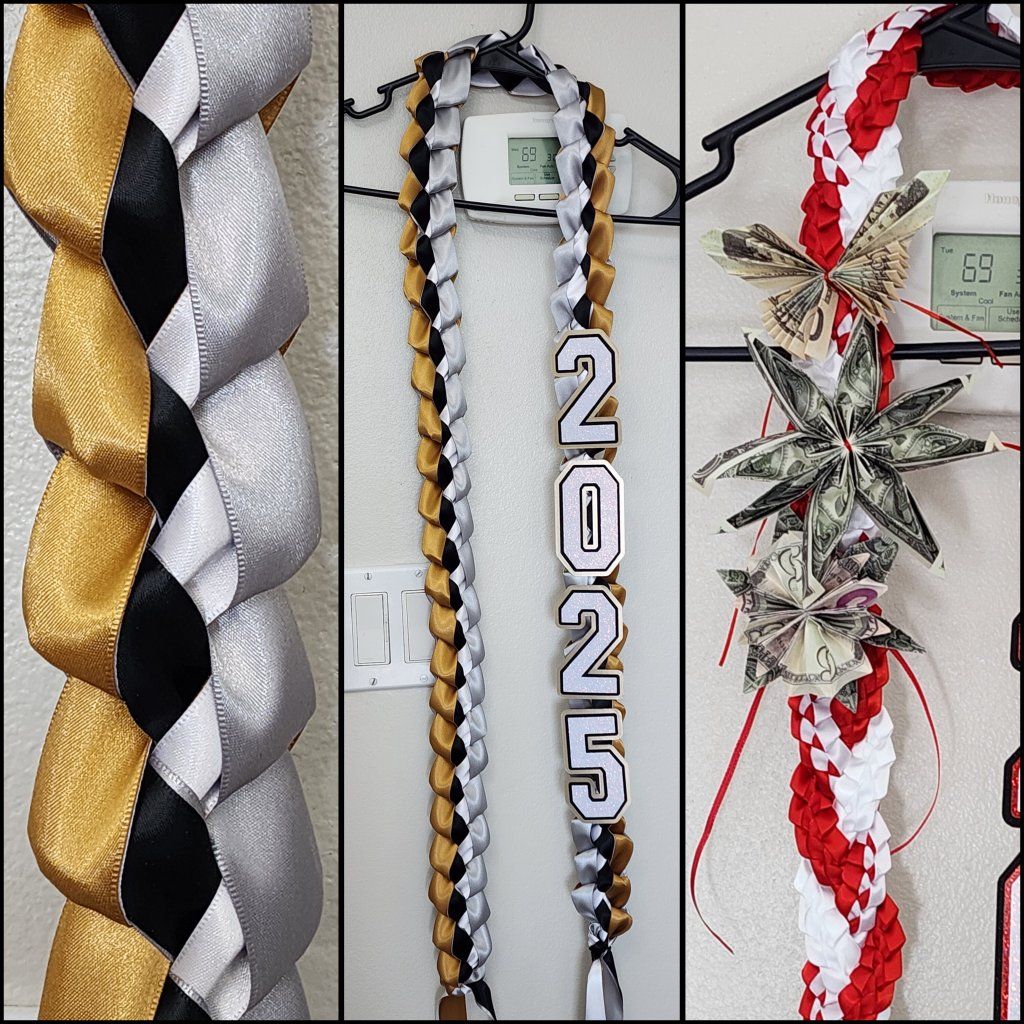 ***Leis start at $25 for a basic 2 ribbon braid with 2026 and go up to $45 i can add fake money flowers at $3 per flower and can add a name for an extra $5. I ask for a nonrefundable 50% deposit upfront for materials and the rest at pick up.
