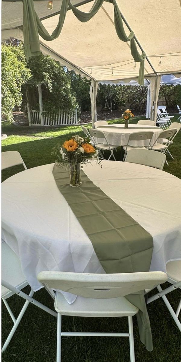 VenmoI have a set of 18 Sage green table runners. 13 of them are brand new and 5 of them are used and have a few marks on them. They are 9ft long and 1 ft across. They are made of polyester. They can be used for many occasions. Weddings, parties, events and etc. selling as a set. Firm on the price. Cash or Venmo.