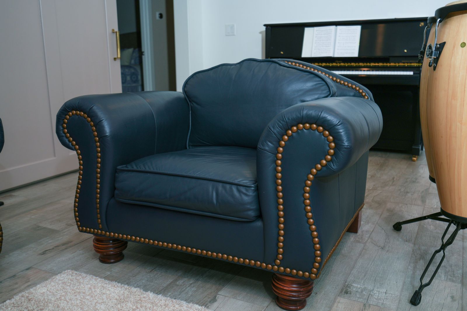 It didn’t clash; it exhaled. Its deep, midnight-hued leather acted as a sophisticated anchor, making the surrounding tan sofa look richer and the chocolate-brown armchairs feel more vibrant. It was the "denim and leather" look perfected—cool, classic, and effortlessly luxurious.