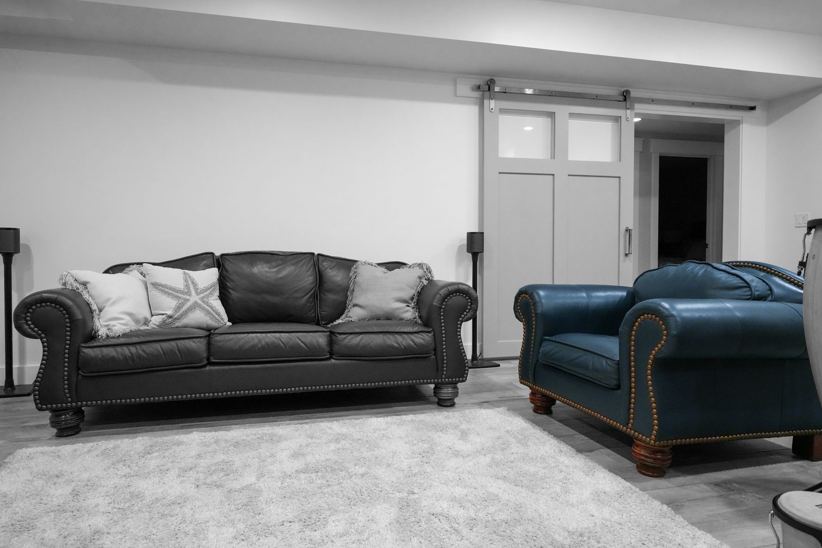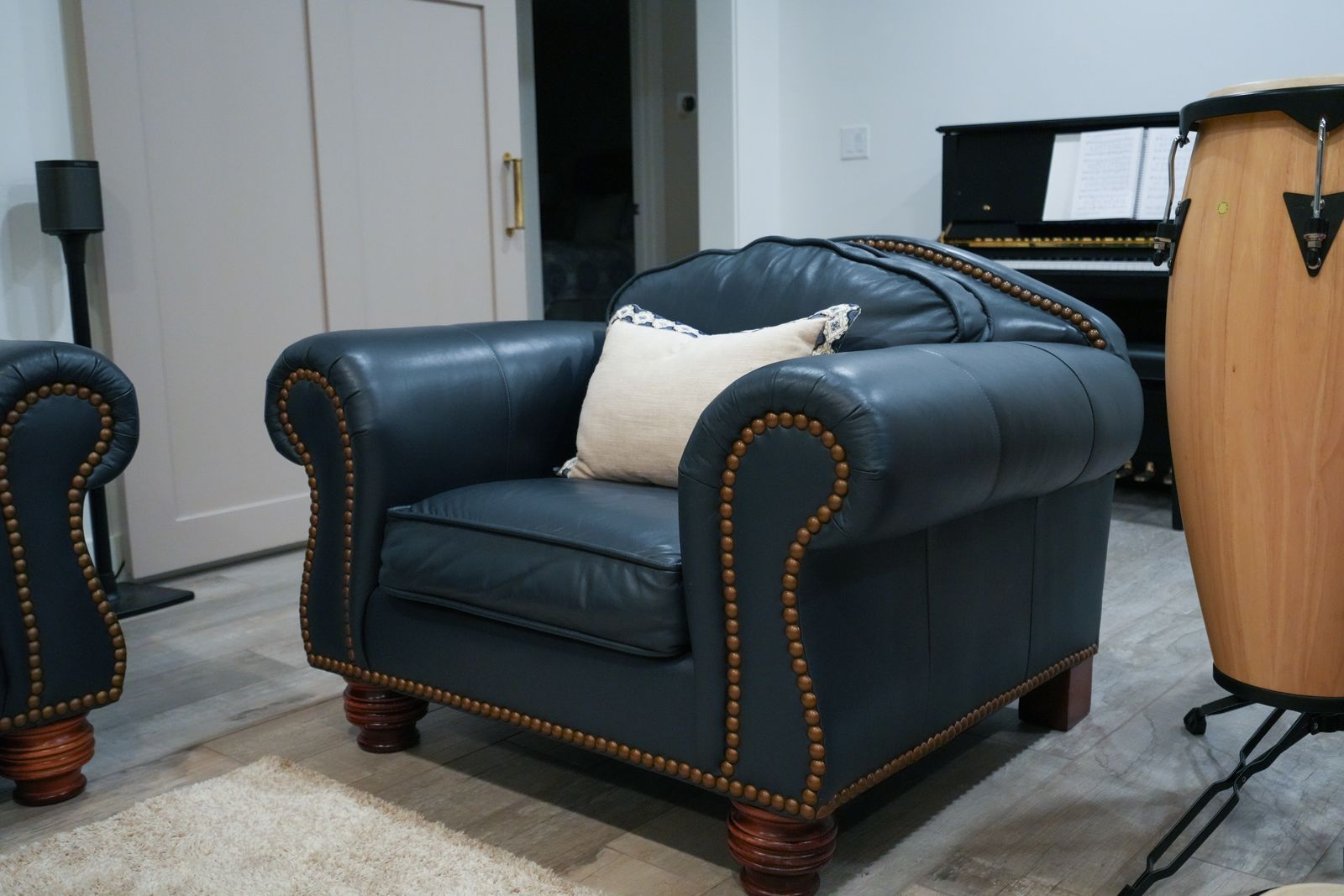 VenmoThe family room was a sanctuary of buckskin-colored leather and walnut shelves—timeless, but perhaps a bit predictable. Then came the Distinction Leather Blue Chair.