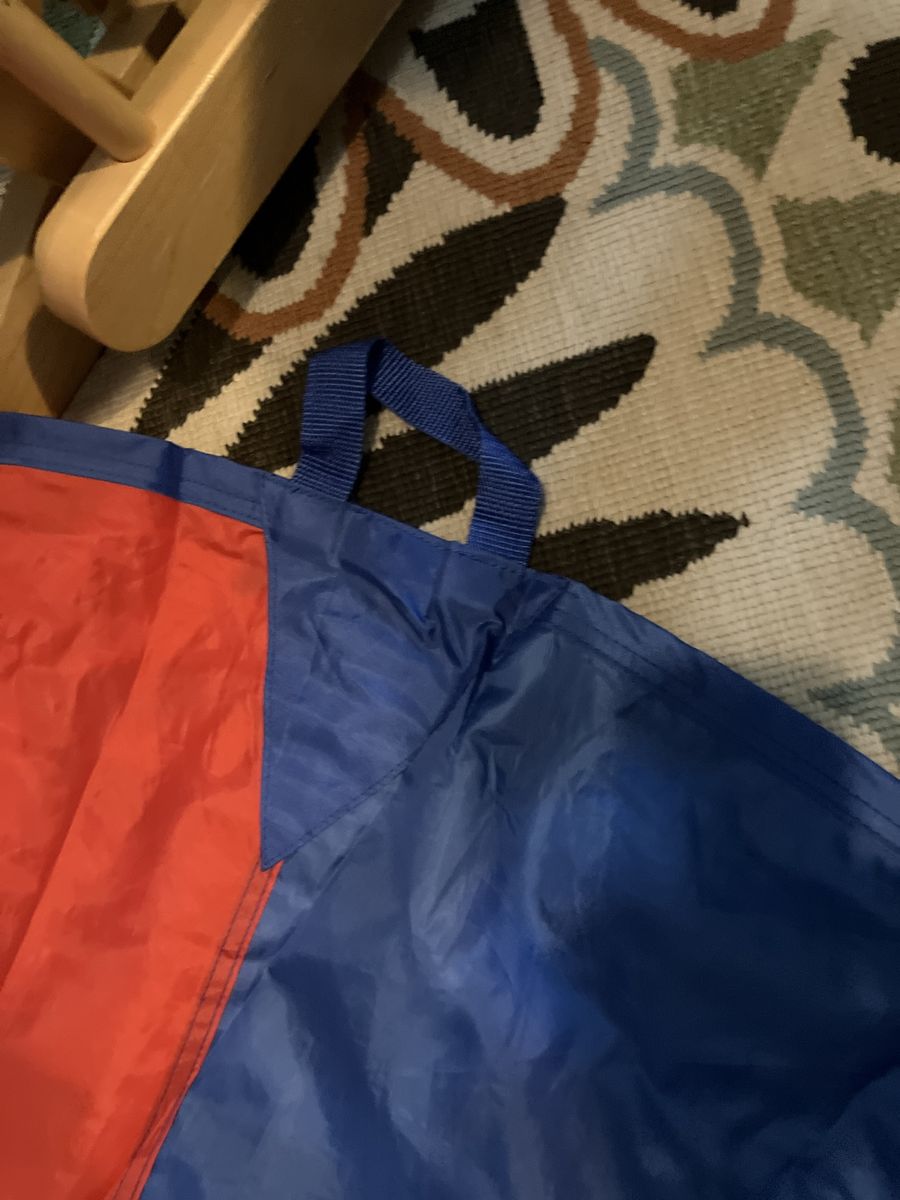 Selling a colorful 8-foot play parachute in excellent, "like new" condition. The brand is from Discount School Supply. This is the professional "Brawny Tough" model, not a cheap toy version. Features 8 very sturdy, reinforced handles and a mesh center for airflow. It is in like-new condition and includes the original blue carrying bag. Perfect for home use, daycare, or a classroom! $25 obo
