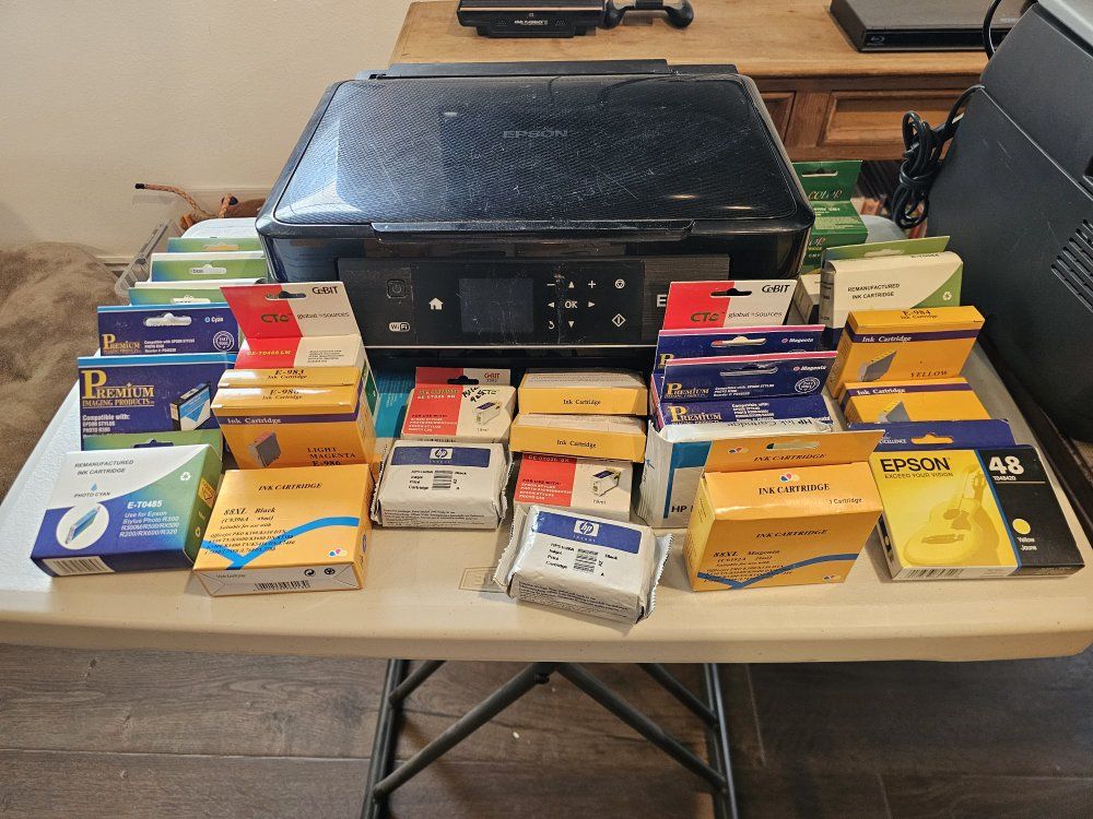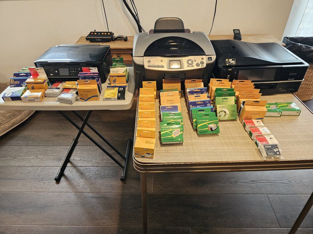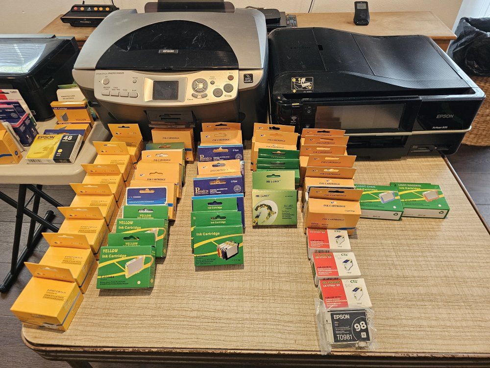 VenmoMassive lot of printer/scanners and ink cartridges (88 ink cartridges). I have 3 Epson printers: an Artisan 835, a Stylus Photo RX620, and an Epson XP420 photo printer. Each can scan to memory card or to print. Comes with a ton of new ink cartridges (88). I used these for photo scanning / printing. These all work, but will likely need print head cleaning for photo printing - as I haven't printed with them for a while. Great for someone who scans & prints a lot! (I used to scan old photos to memory card). I've since upgraded to a super fast scanner and a new photo color printer and just don't need these anymore. (Cleaning up my office) (At $50, that's close to 50 cents per new ink cartridge and the printers end up being free.) FCFS Priced for a quick sell...