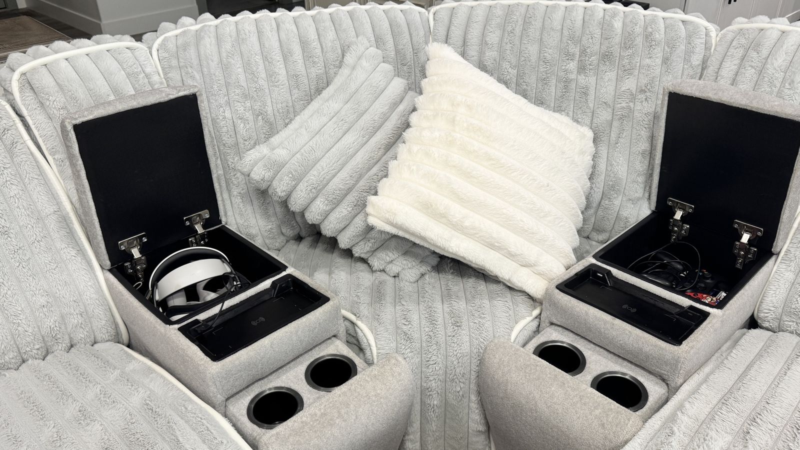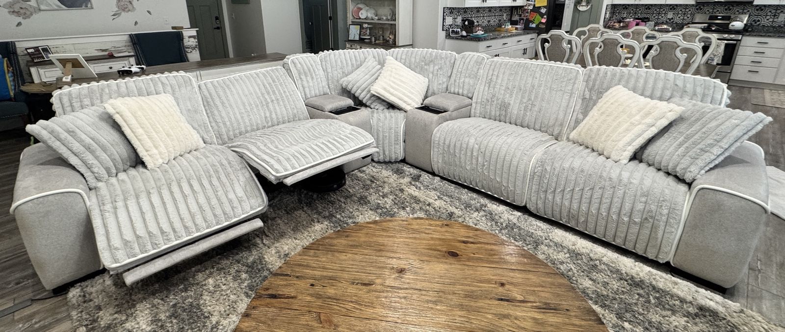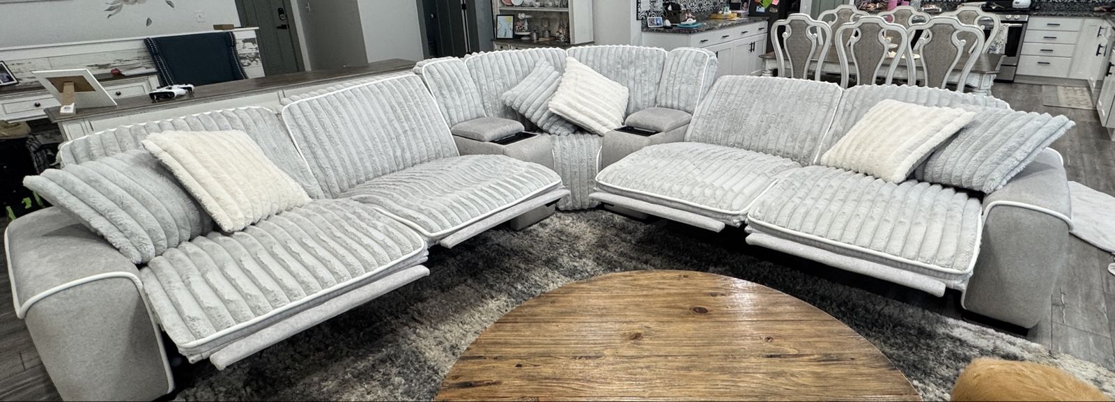 Venmo4 recliners 2 storage armrests with wireless charging and cup holders less than a year old super comfortable. Just decided to change up our front room. Paid 3500 less than a year ago at RC willey