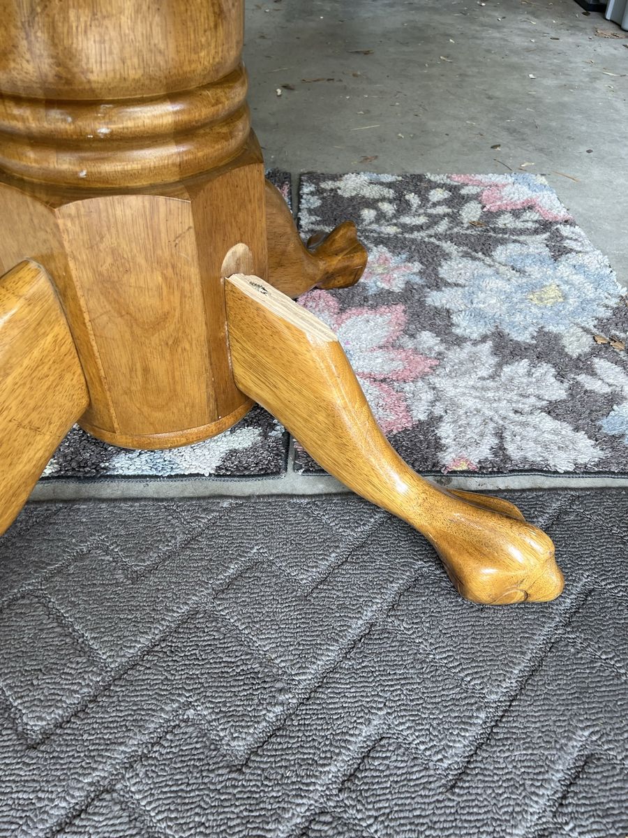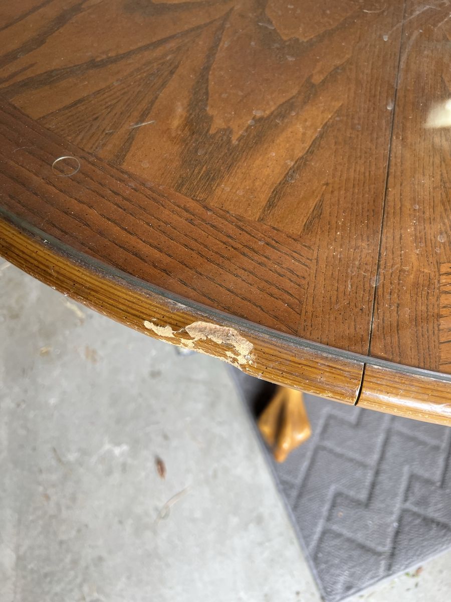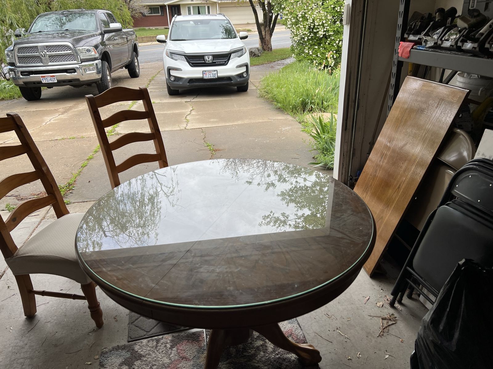 4 ft round dining table with cut glass piece for top. Also a center leaf to make the table 6’ long when needed. 1 dining chair left too. The table and chairs got damaged on our trip here. I’m sure someone can repair the damaged parts as needed. See pictures. I do have the piece of wood for the table leg so it can be glued back together