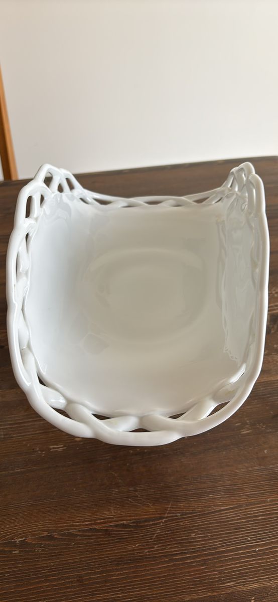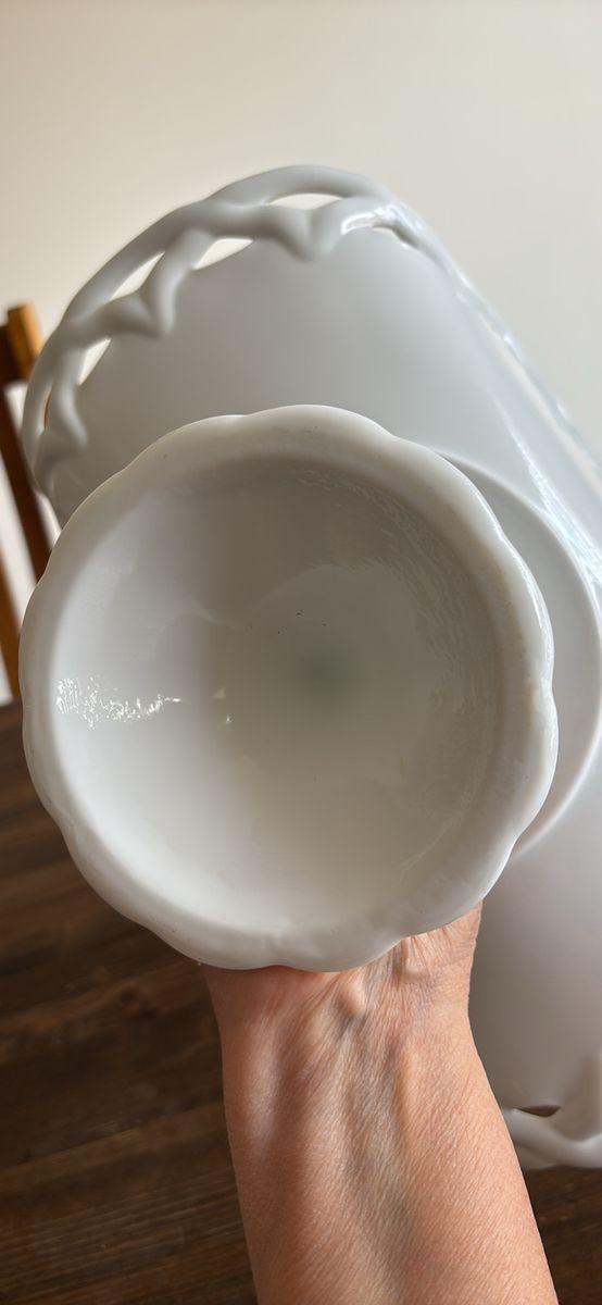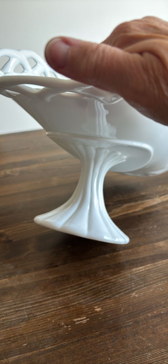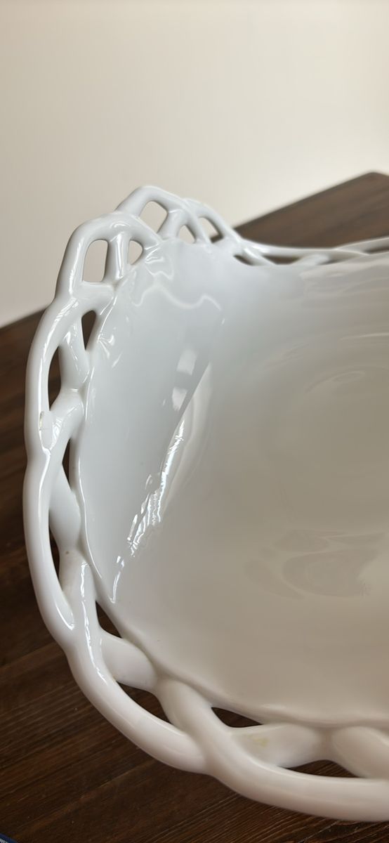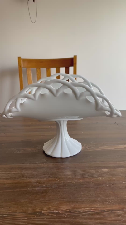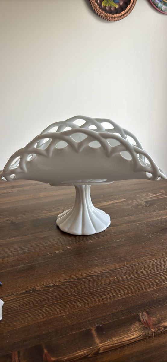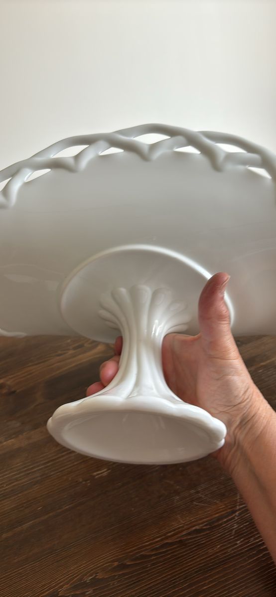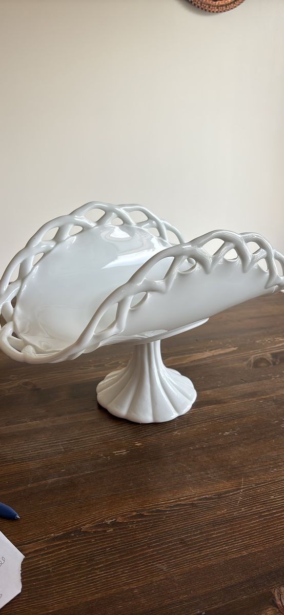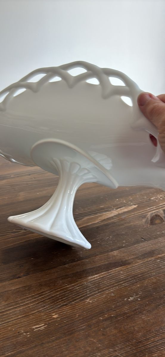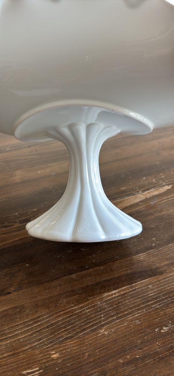 VenmoVintage milk glass pedestal plate stand banana fruit bowl 13.5”L 9”H 7.5”W Stunning addition to any collection or home decor Beautiful brilliant white color Charming, functional, and decorative Definitely a statement piece at approximately 5 pounds Unbranded No chips. No cracks. Like new. See video and photos. Non smoking home Sandy porch pick up Ships