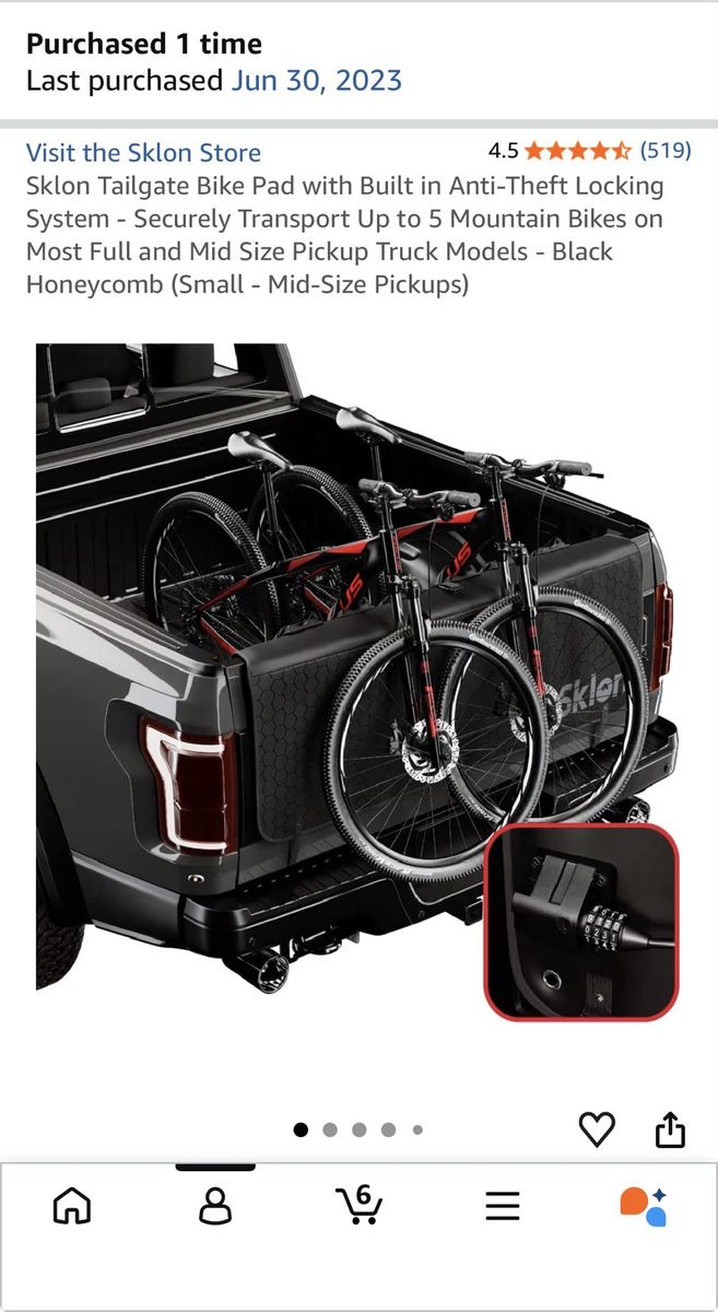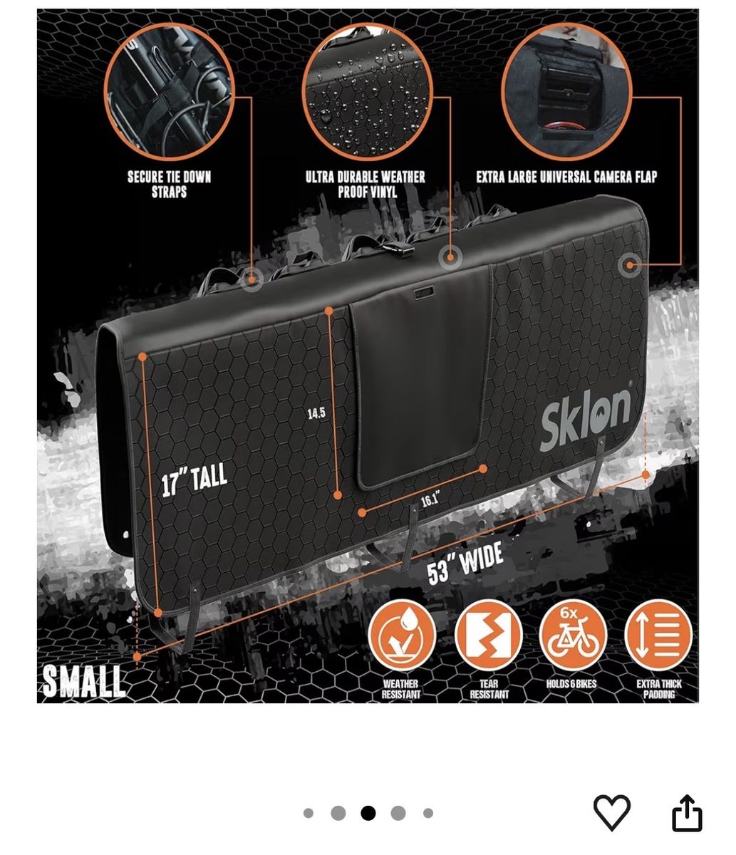 Sklon Tailgate Bike Pad with Built in Anti-Theft Locking System - Securely Transport Up to 5 Mountain Bikes on Most Full and Mid Size Pickup Truck Models. We bought this model a few years back and only actually used it once as we had to sell sold our truck. So essentially it’s been sitting in our garage collecting dust for some time. So it is basically brand new and an awesome thing to have.