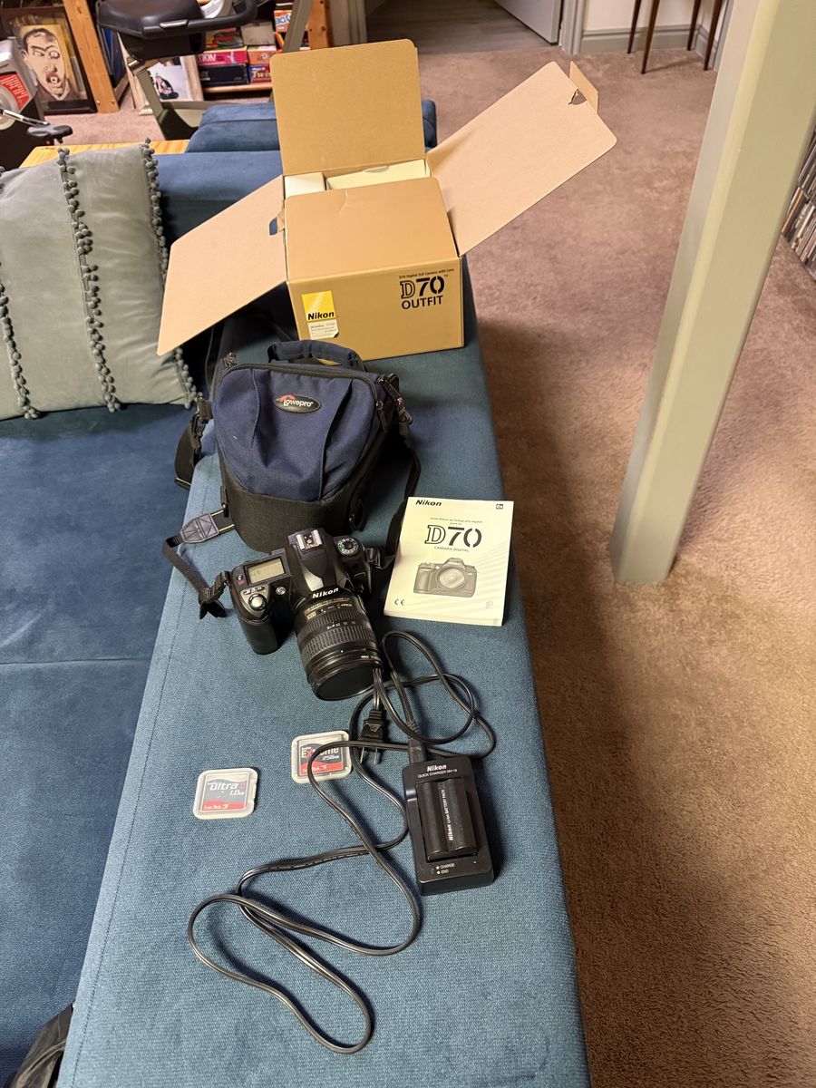 ZelleNikon D70 with Nikkor 18-70 Auto-focus lens, extra battery and 2 extra compact flash cards. 6.1 megapixels but photo quality exceeds expectations due to incredible lens and sensor. Professional quality even if a bit dated. Original packaging and a carry case are included. New same lens sells for around $600.