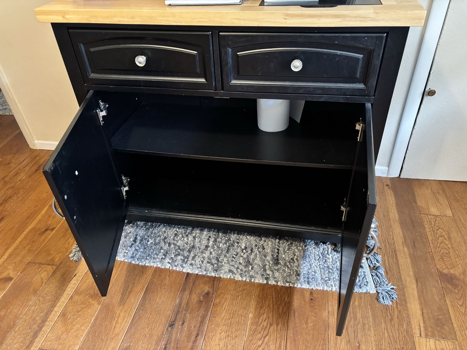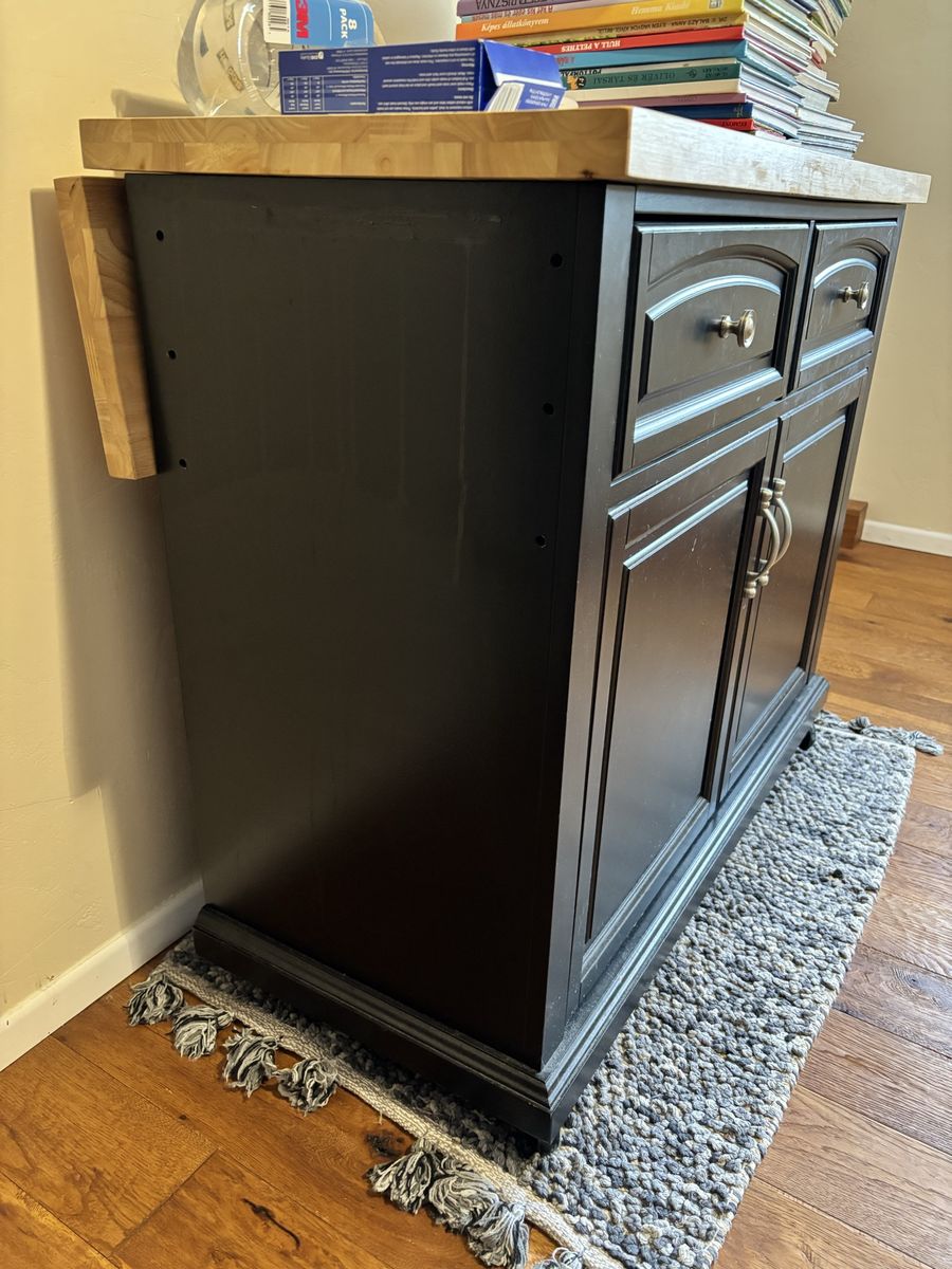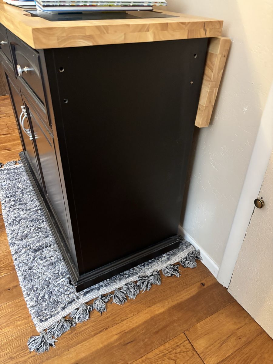 VenmoBlack wooden bar cart with light wood table top. 2 pull out drawers, two opening doors with ability for shelves inside. Has wheels but they can be removed. Back side of table top lifts to open to make a larger table space. $150 OBO. Eager to sell, make me an offer.