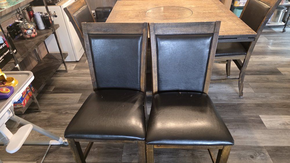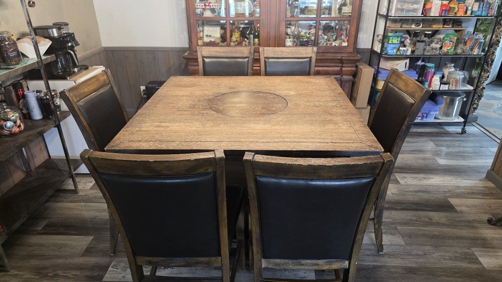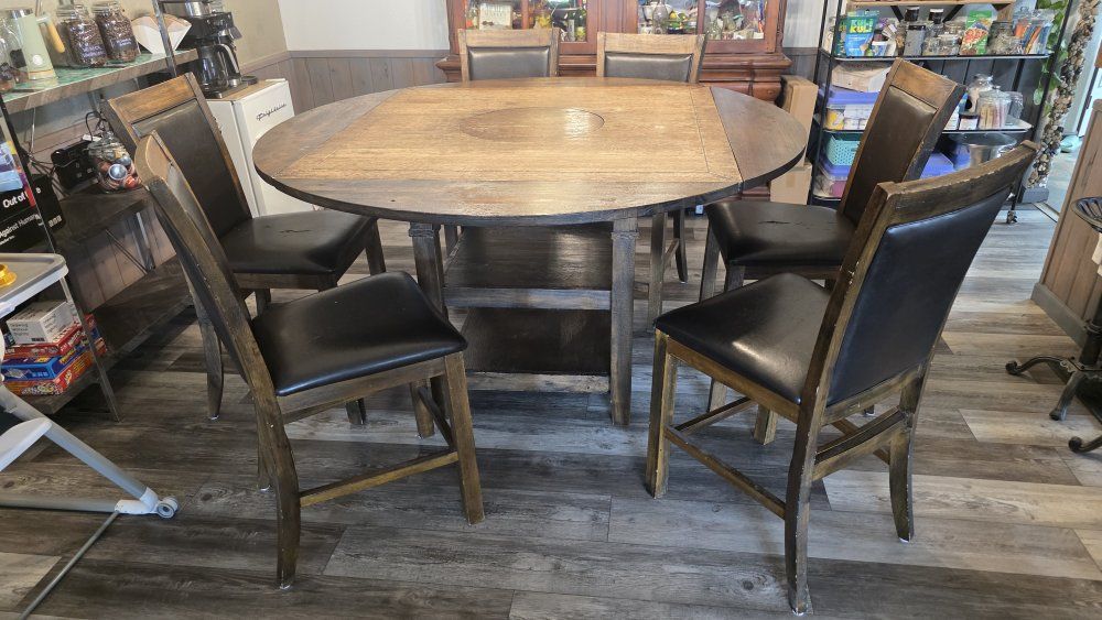 Features: • Seats 6 comfortably (can fit more when expanded) • Converts: Bar height Standard height • Expands: Square Large round table with leaves • Built-in Lazy Susan • Two storage shelves underneath • Solid wood with warm, rustic finish • Includes 6 matching chairs