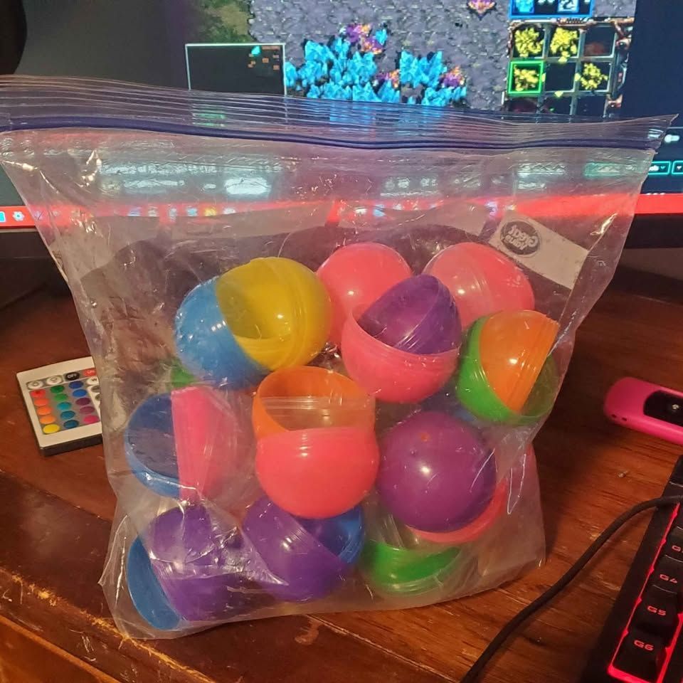 A bag of a bunch of random empty gacha prize capsules.