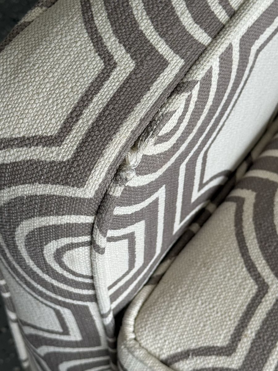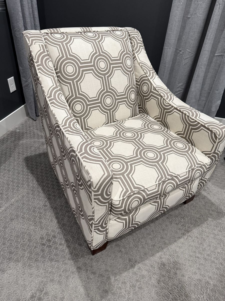 VenmoThis is a really nice charcoal gray and off white accent chair, in good condition. There is a slight blemish on the arm as pictured.