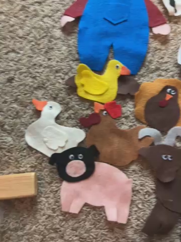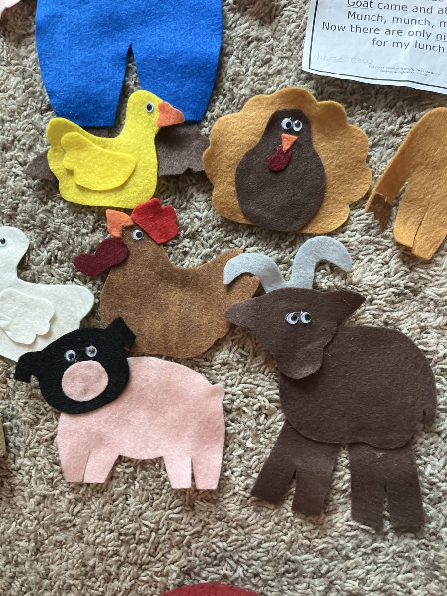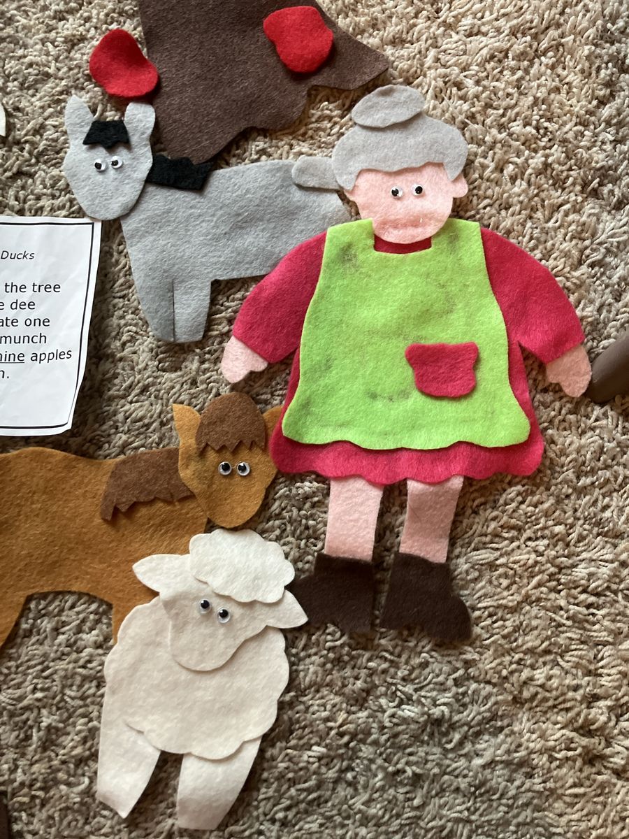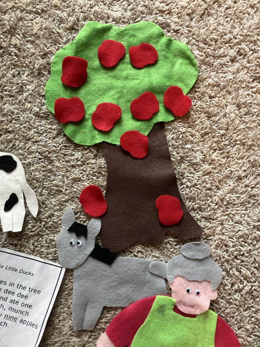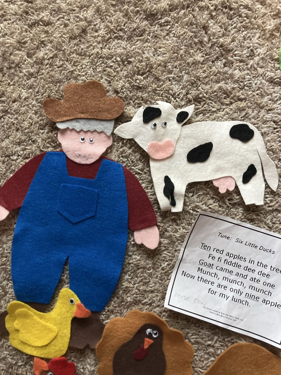 This complete Ten Red Apples in the Tree felt board story set is in excellent condition and ready for a new home. It is a wonderful educational tool for parents, teachers, or homeschoolers to use during circle time or for interactive play at home. The set includes a large brown tree with a green leafy top, ten individual red apples, a farmer, a grandma figure, and a variety of friendly farm animals including a cow, horse, sheep, goat, turkey, duck, goose, and pig. All pieces are handmade from high-quality felt with great attention to detail and feature bright, engaging colors that capture a child's attention. it includes the lyrics for storytelling and counting activities.