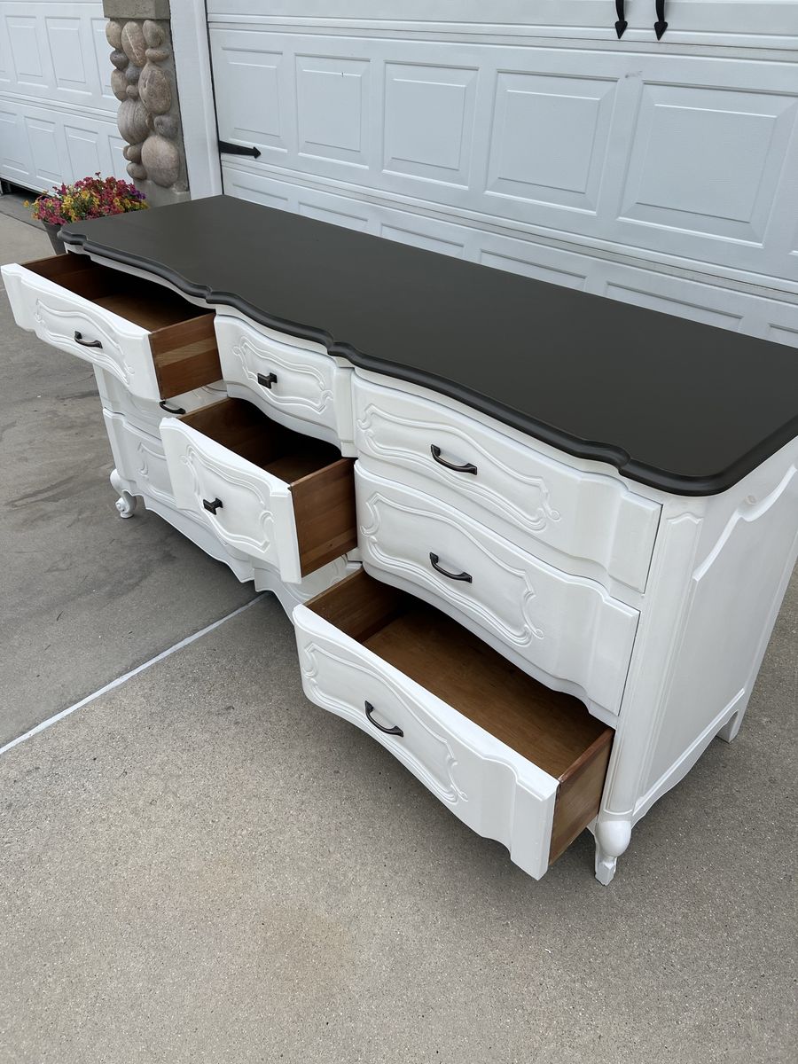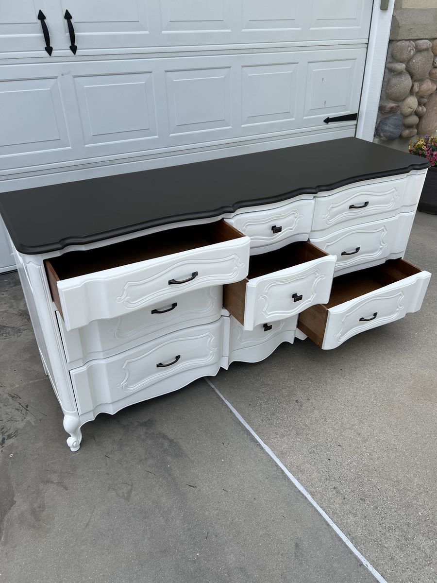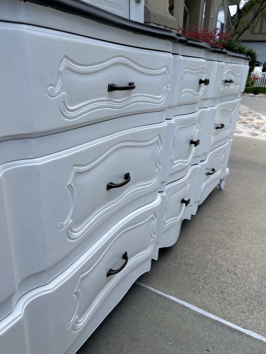 VenmoThis beautiful dresser is very strong, sturdy and heavy duty! There are 9 spacious drawers, all work well and slide smoothly. The dresser has been completely refinished in a beautiful white paint with a deep mocha brown on top. The hardware is oil brushed bronze and all brand new.