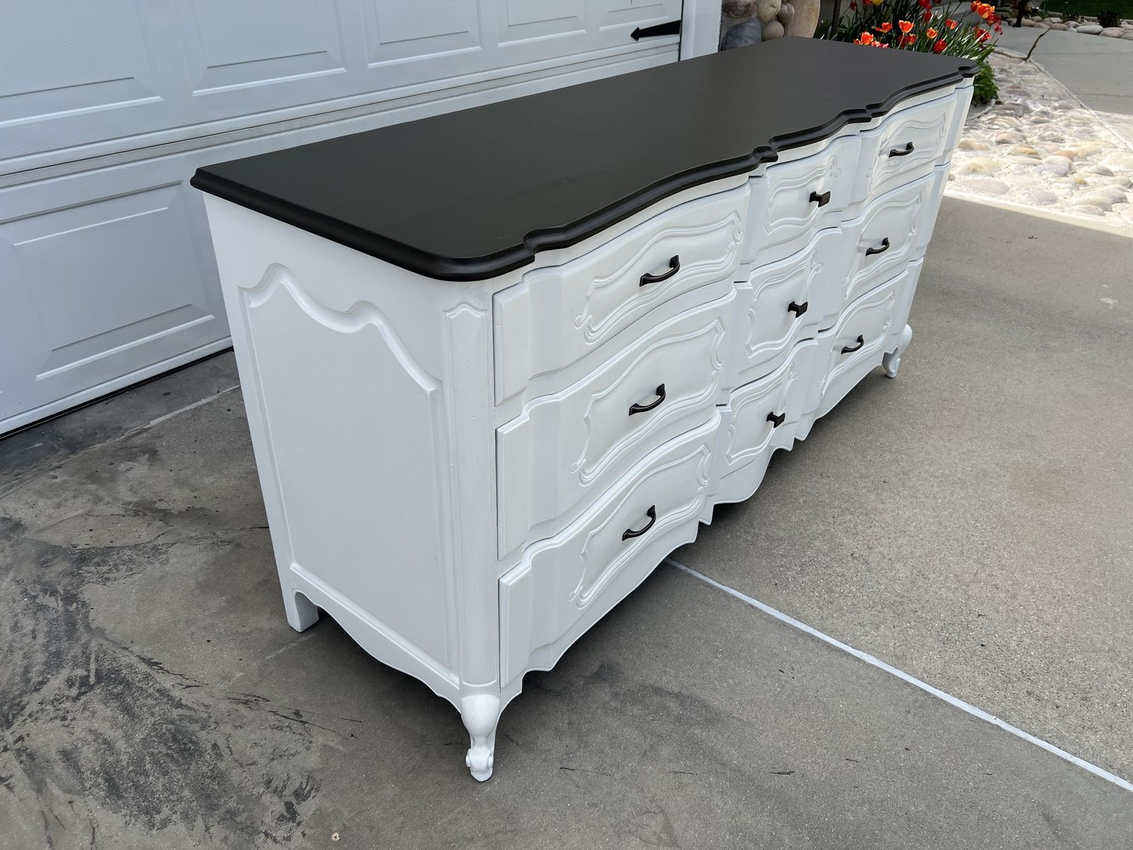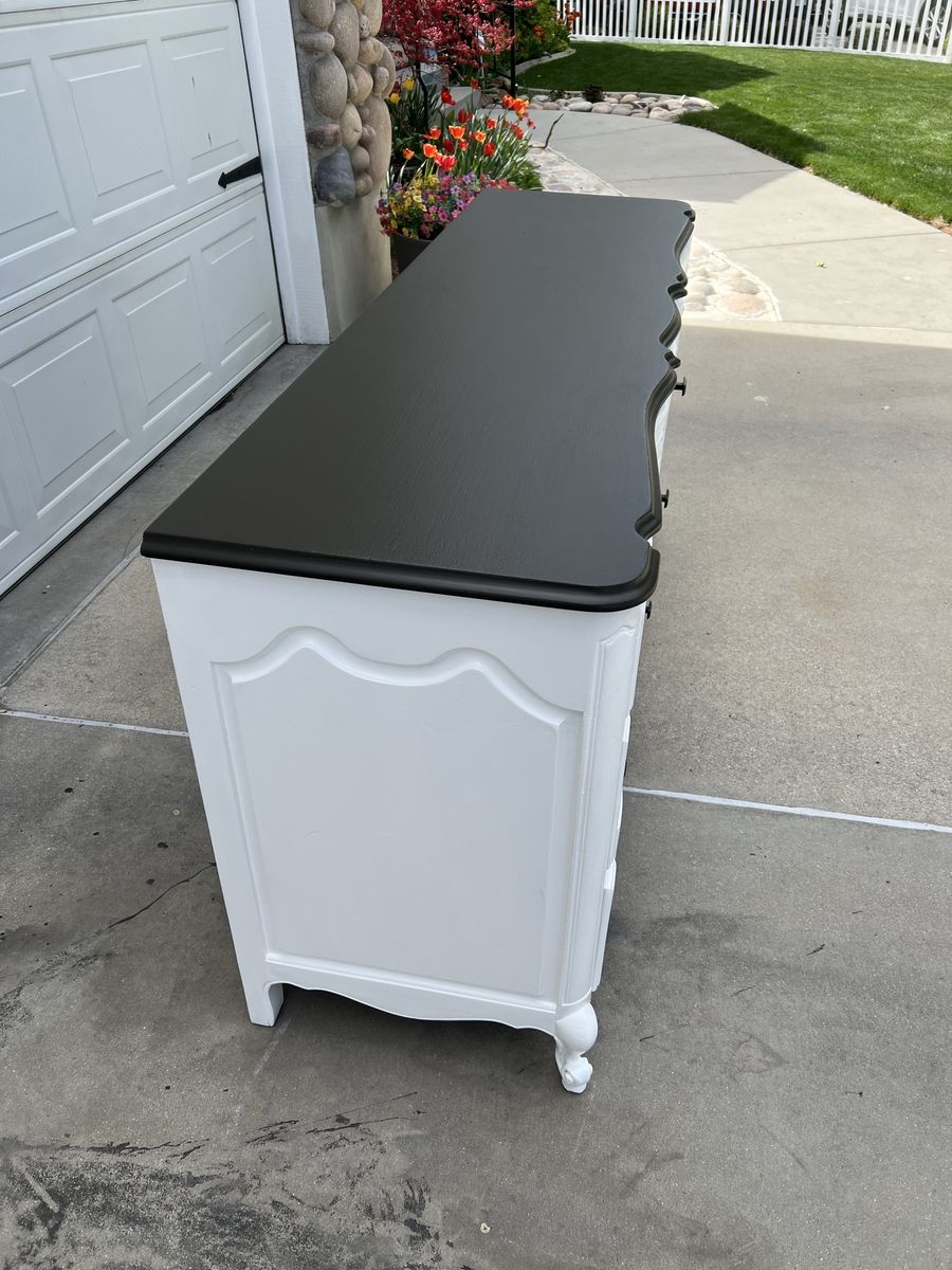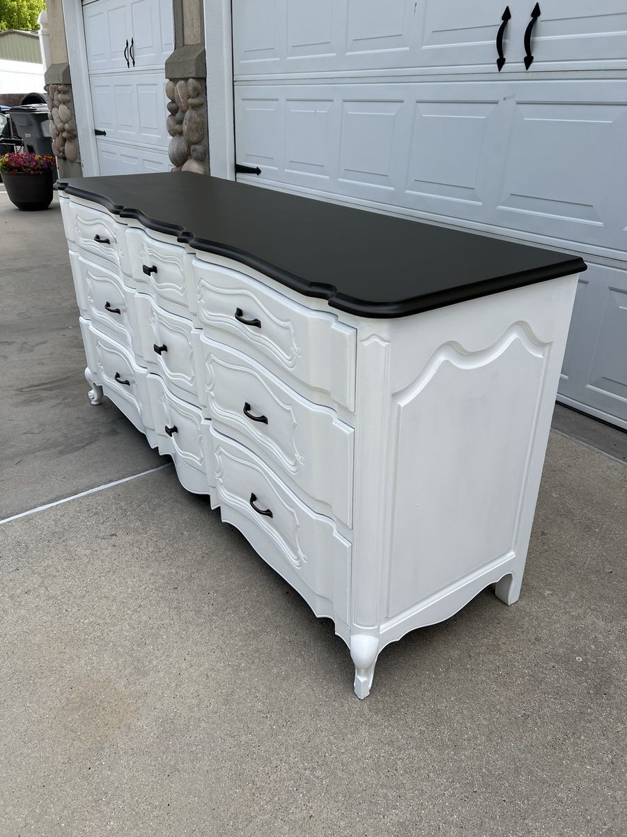 VenmoThis beautiful dresser is very strong, sturdy and heavy duty! There are 9 spacious drawers, all work well and slide smoothly. The dresser has been completely refinished in a beautiful white paint with a deep mocha brown on top. The hardware is oil brushed bronze and all brand new.