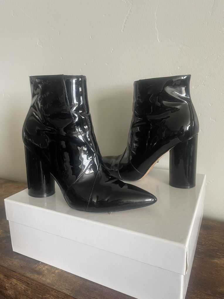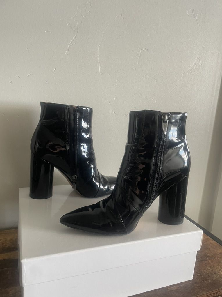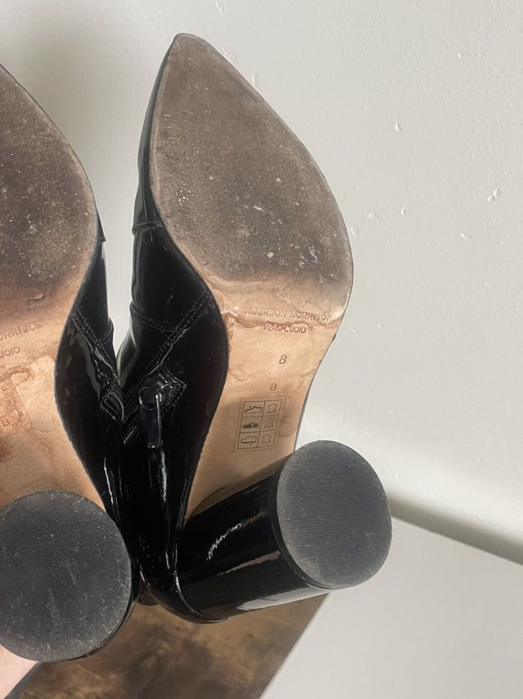 VenmoSigerson Morrison Patent Leather Booties — Size 8 | 3.5” Heel High gloss patent leather, sharp pointed toe and that chunky cylindrical block heel that makes these anything but basic. The contrast of the sleek pointed front against the bold round heel is what sets these apart — architectural and polished all at once. Hate parting with these but need to downsize and many multiple pairs of pointy black boots is too many. Wear on soles only — boot pristine. No box. ∙ Condition: Excellent ∙ $295