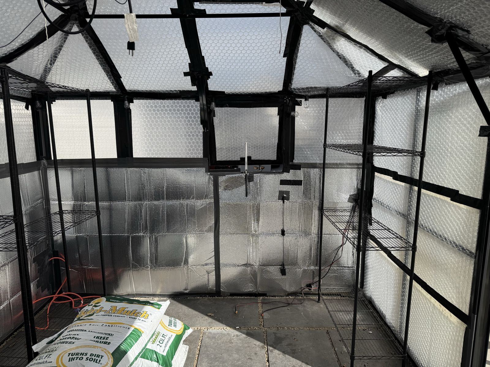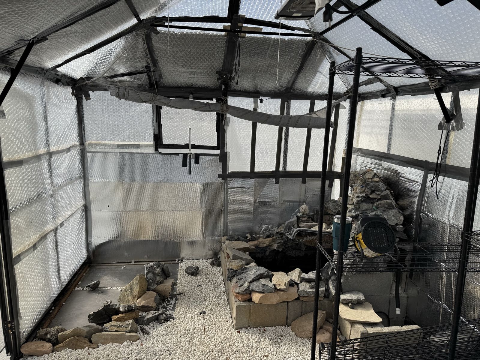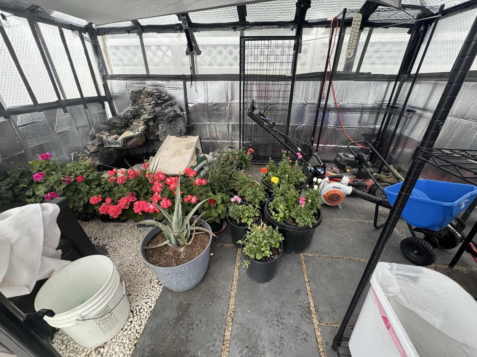 There are quite a few things that are included that make this an awesome purchase: the floor is filled in with pea gravel. The white surface stones are a nice addition to making it look pretty as well as the exterior trex / wood frame. The floor tiles also included as well as mulch glue, one shelving unit, 50 foot and 100 foot outdoor extension cords. We lined the inside with bubble wrap and with reflective wrap, which made a huge difference with Insulation over the winter. We have an additional roll of bubble wrap that will be included as well as string lights. The fountain / stones could be carefully disassembled and repurposed if interested otherwise we can remove those materials.