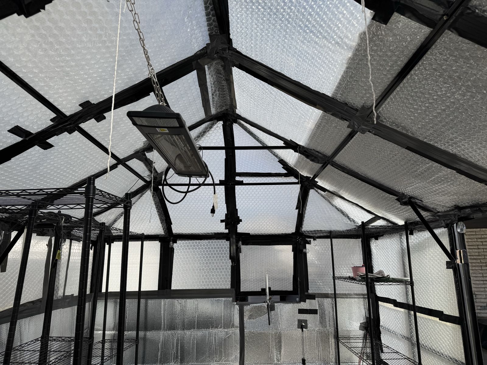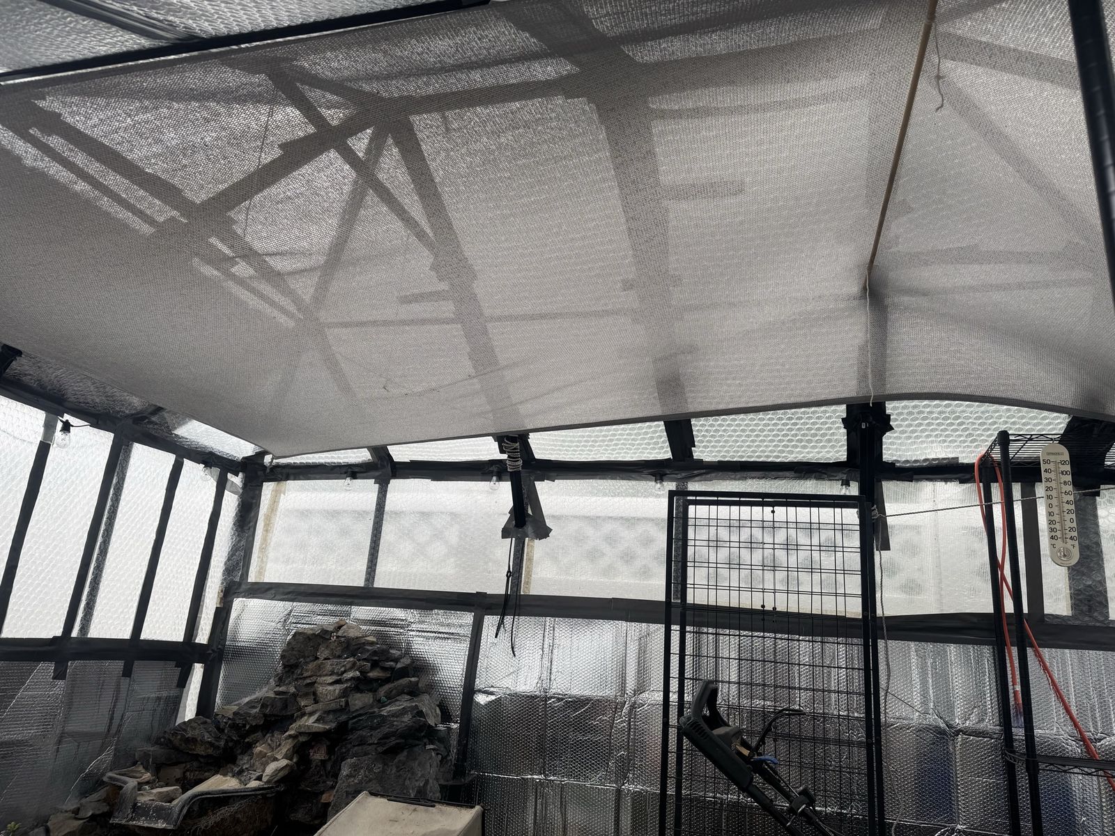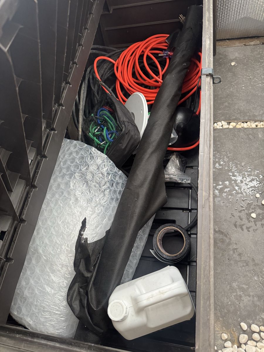There are quite a few things that are included that make this an awesome purchase: the floor is filled in with pea gravel. The white surface stones are a nice addition to making it look pretty as well as the exterior trex / wood frame. The floor tiles also included as well as mulch glue, one shelving unit, 50 foot and 100 foot outdoor extension cords. We lined the inside with bubble wrap and with reflective wrap, which made a huge difference with Insulation over the winter. We have an additional roll of bubble wrap that will be included as well as string lights. The fountain / stones could be carefully disassembled and repurposed if interested otherwise we can remove those materials.