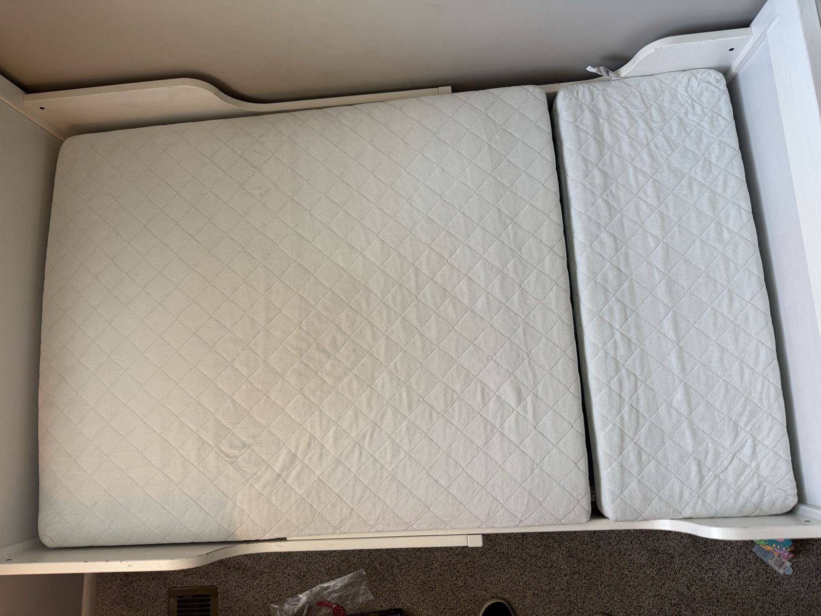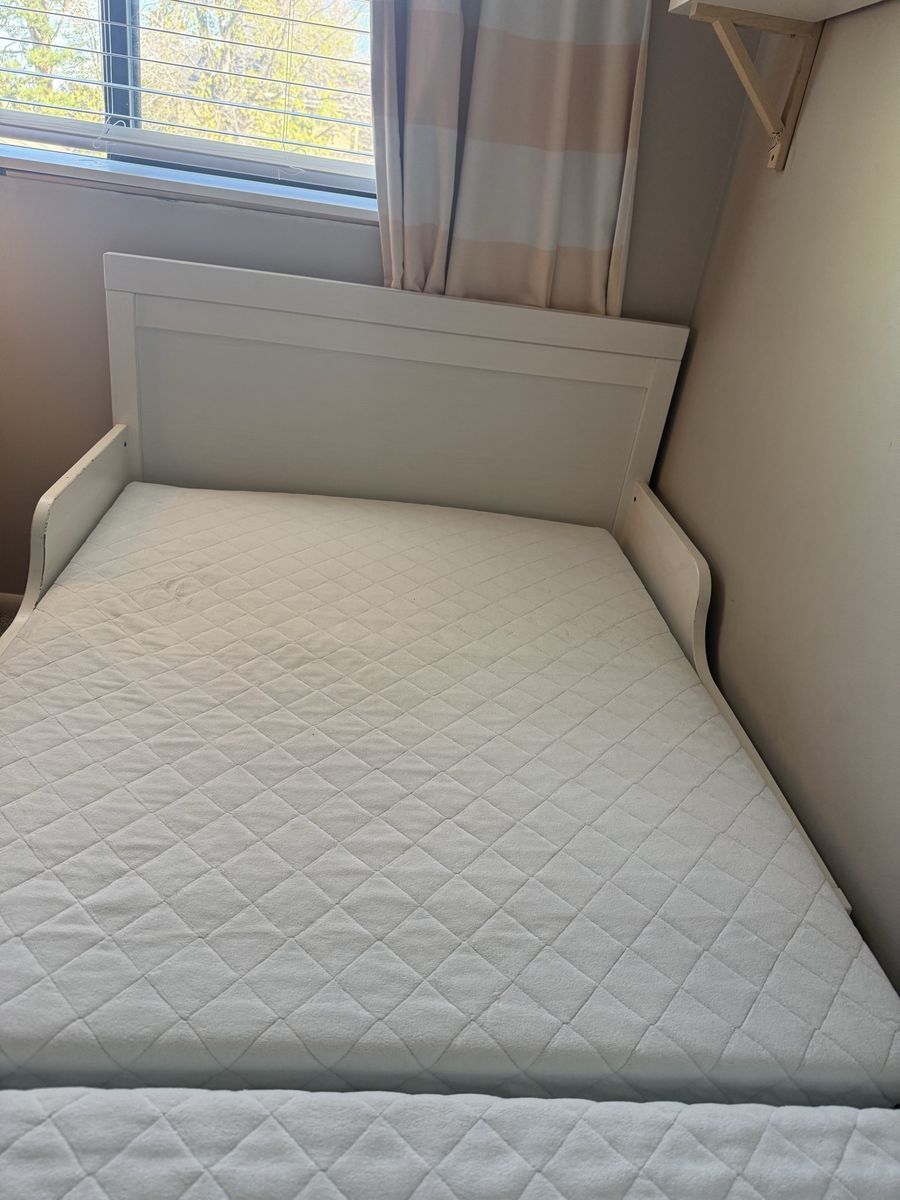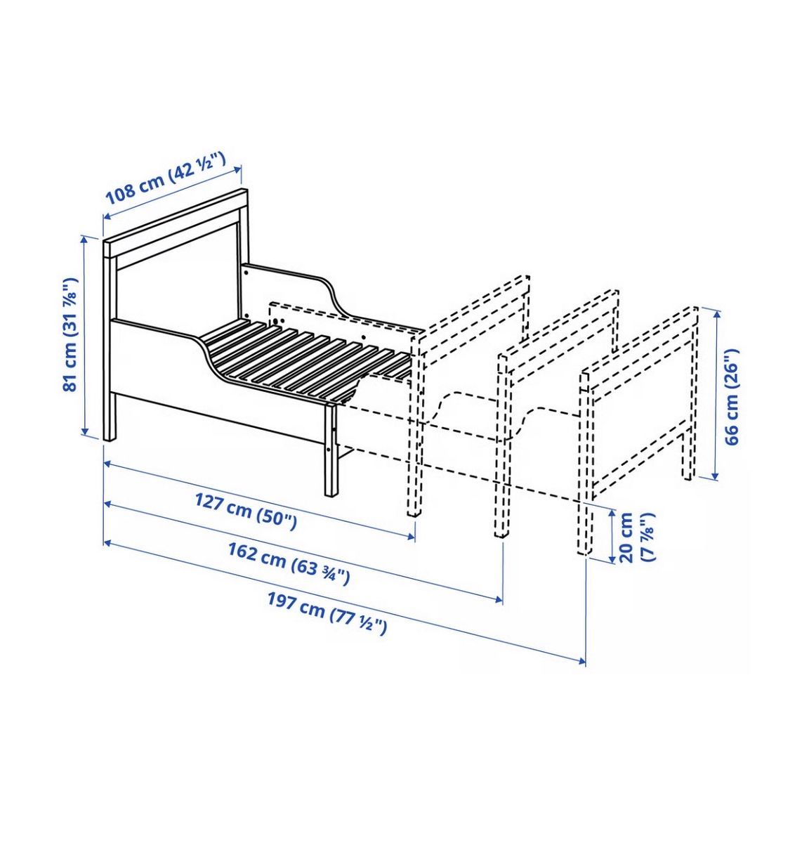 Measurements Min. length: 50 " Max. length: 77 1/2 " Width: 42 1/2 " Headboard height: 31 7/8 " Footboard height: 26 " Mattress length: 74 3/4 " Mattress width: 38 1/4 " Free height under bed: 7 7/8 " Max. load: 220 lb