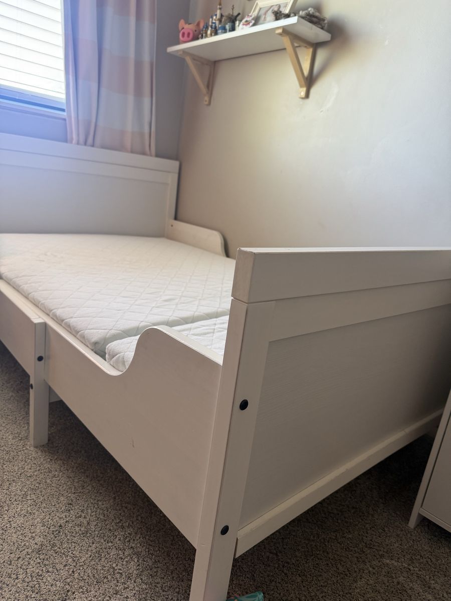 White SUNDVIK Ext bed frame with slatted bed base.