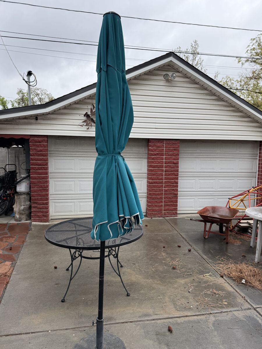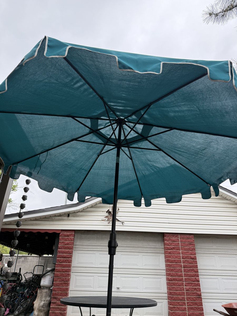 Both are in perfect working order. The umbrella has a crank, tilts if wanted, and is 9ft in diameter. It’s been kept under an awning during winters and has no wear spots.