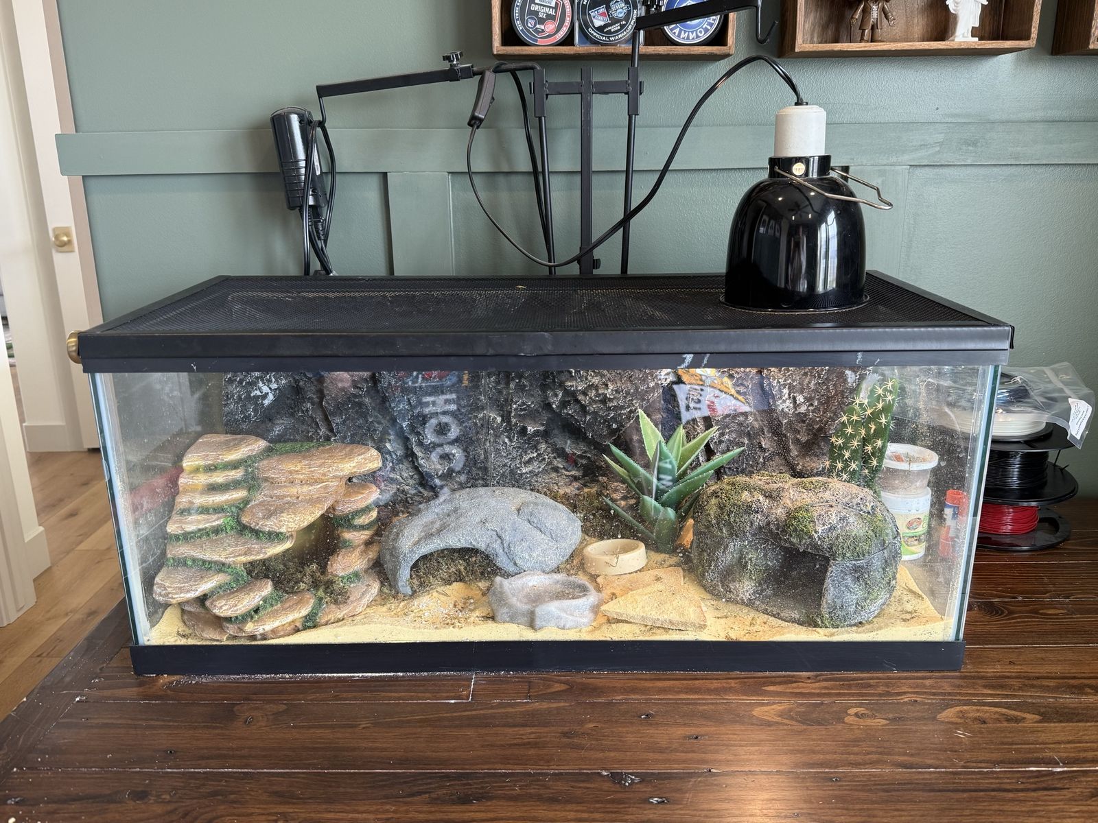 VenmoChinese Cave Gecko was born just before Christmas. The tank comes with all the supplies. Bought brand new in December. Comes with heating pad underneath, heat lamp, poop scoop, and all accessories inside.
