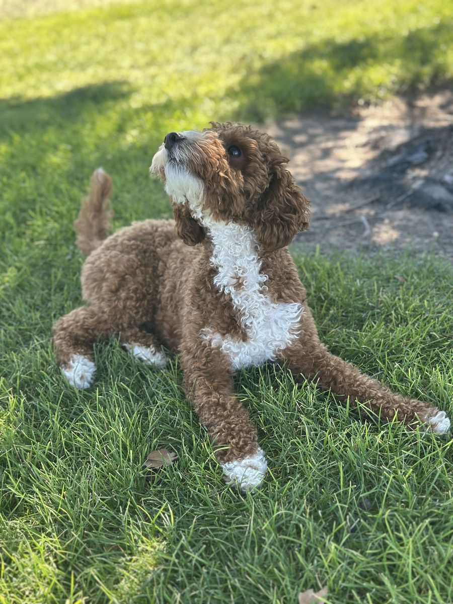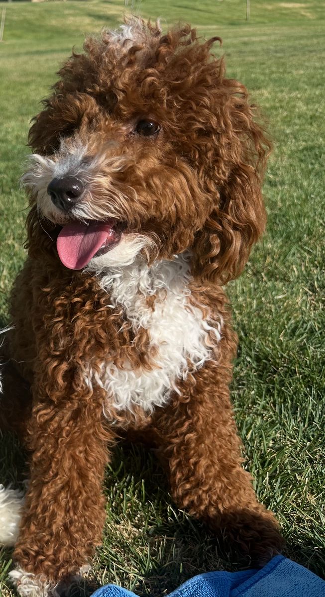 About SnickersMeet Snickers, our adorable red F1B Goldendoodle stud with a stunning deep red coat, bright white tuxedo chest, and white socks. He has that classic teddy bear look that families are always looking for.