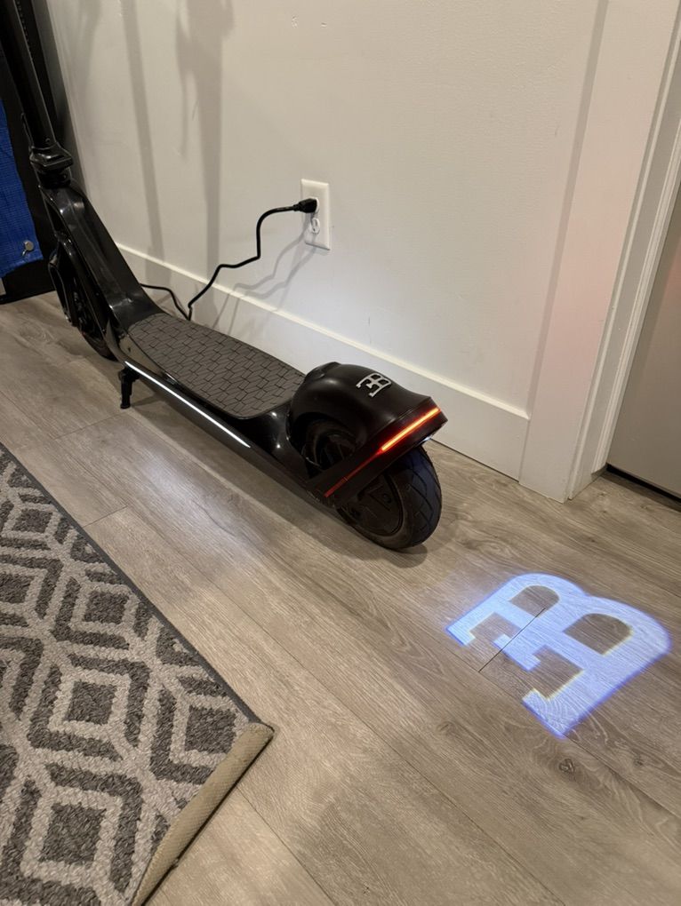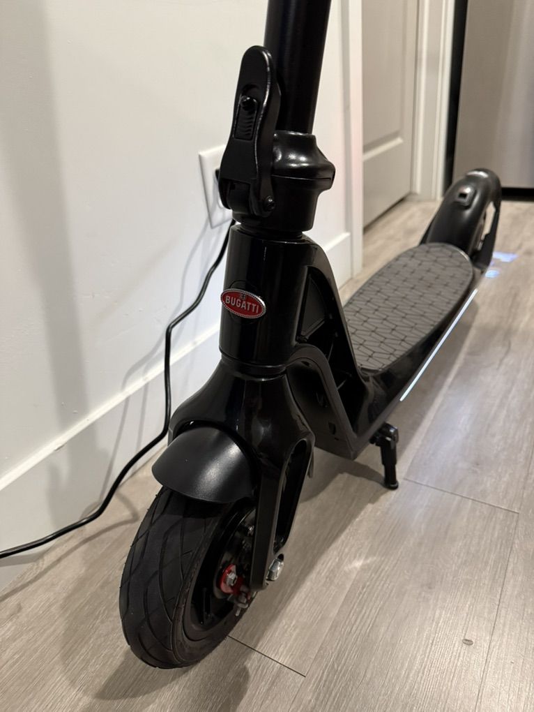 VenmoBugatti 10.0 electric scooter. Has front and rear lights for riding at night. Super cool Bugatti logo projects on the ground behind it. Comes with charger too and fully charged ready to go. Does have some scuffs and scrapes. Top speed is 22mph, If serious please message me.
