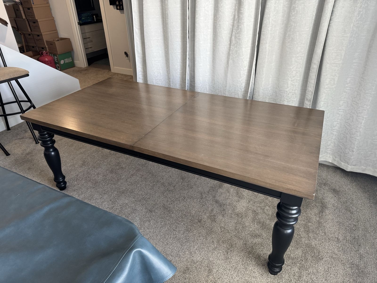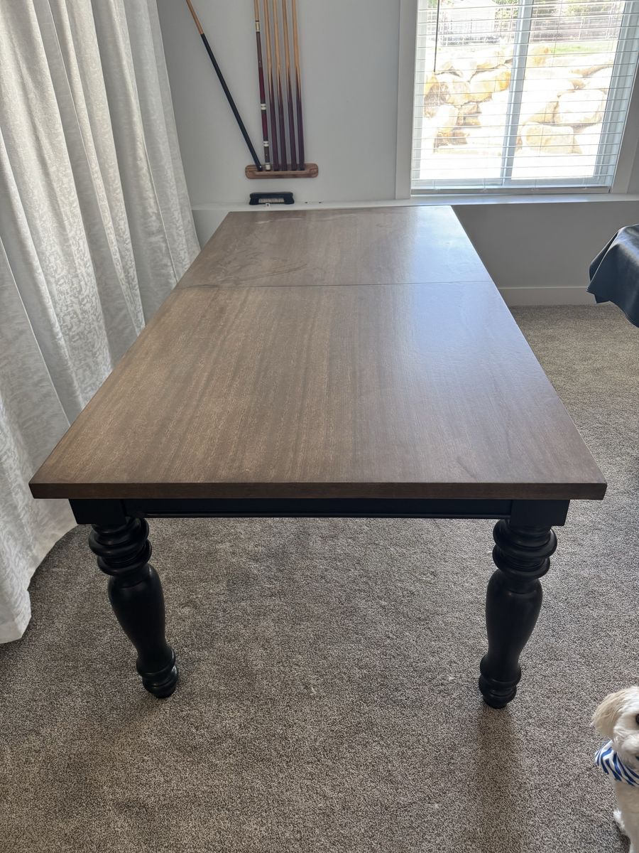 ApplePayVery nice hardwood dining table. Has just been refinished and is in excellent condition. Measures 84” long and 42” wide. Includes a leaf that extends the length another 18”. Smoke free home.
