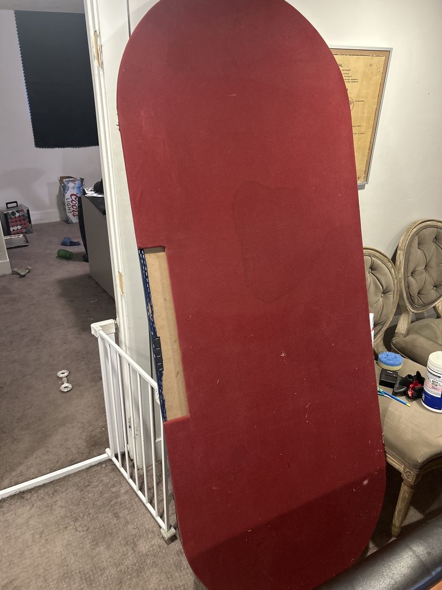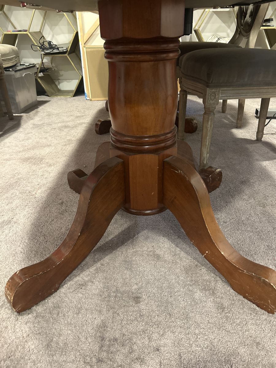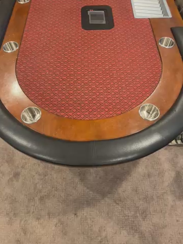 Venmo10'x4'. Thick cherry wood table. Leather cushion. Carved thick base posts with attached thick legs. 2 protective felt-covers. Minor surface damage to legs. Plug-in auto-shuffler.