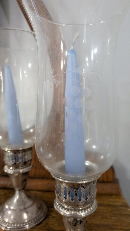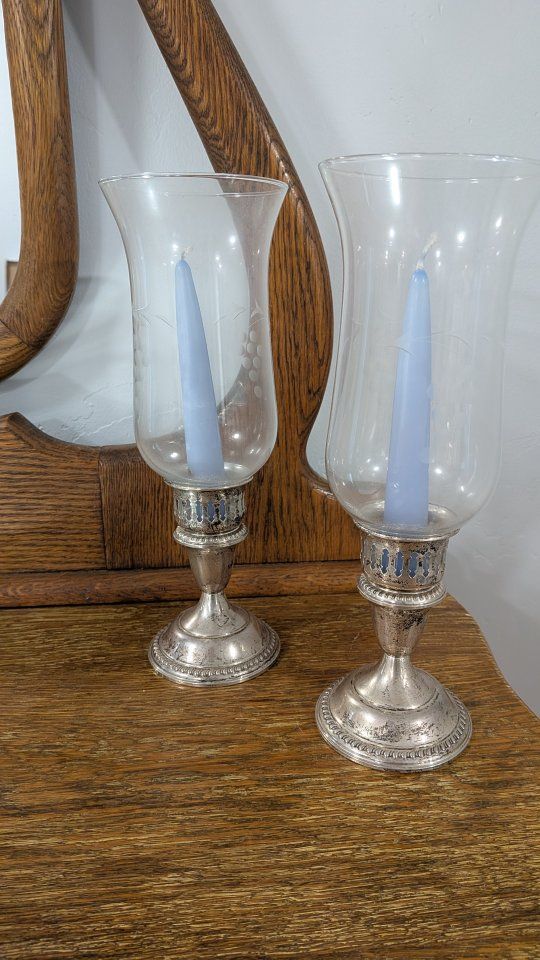 hurricane lamp candlestick holders with silver base and grape leaf etching