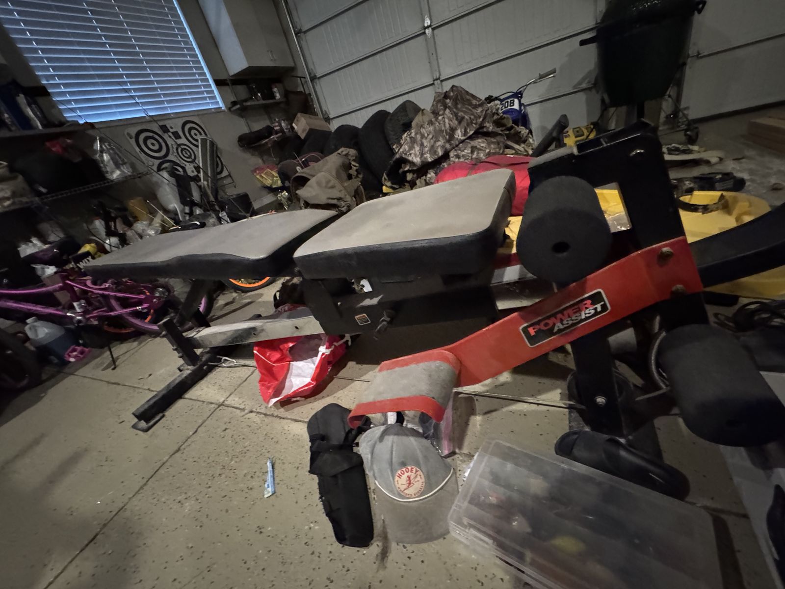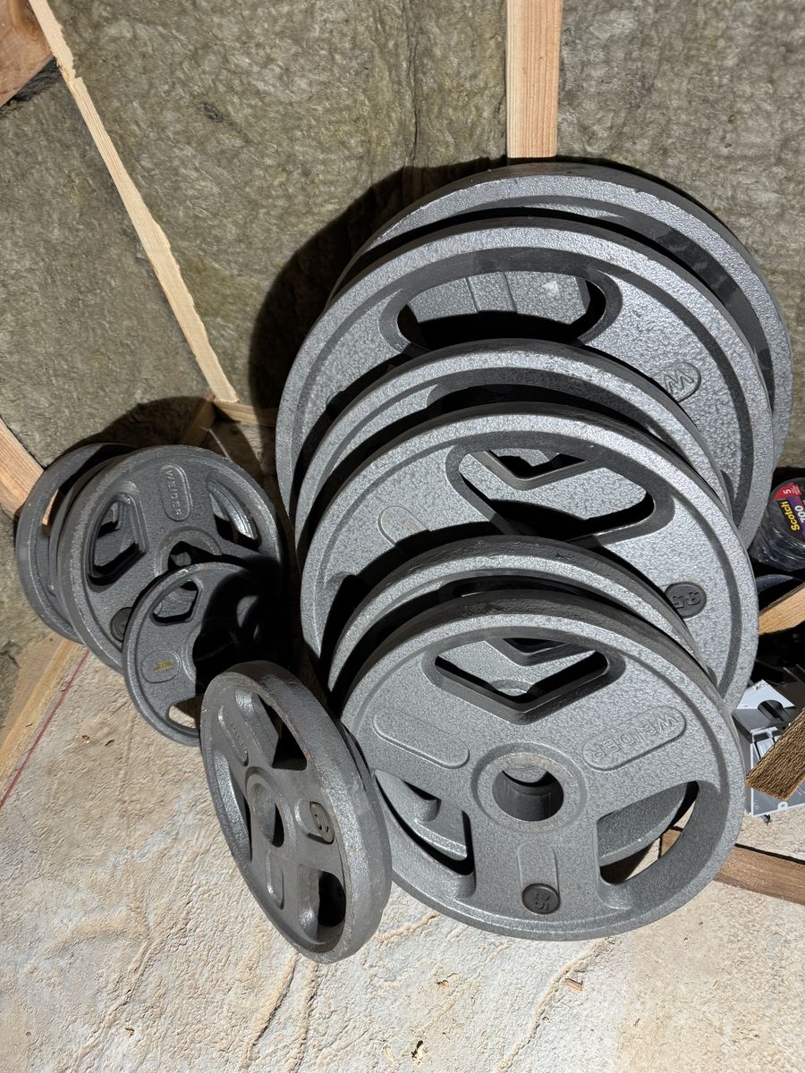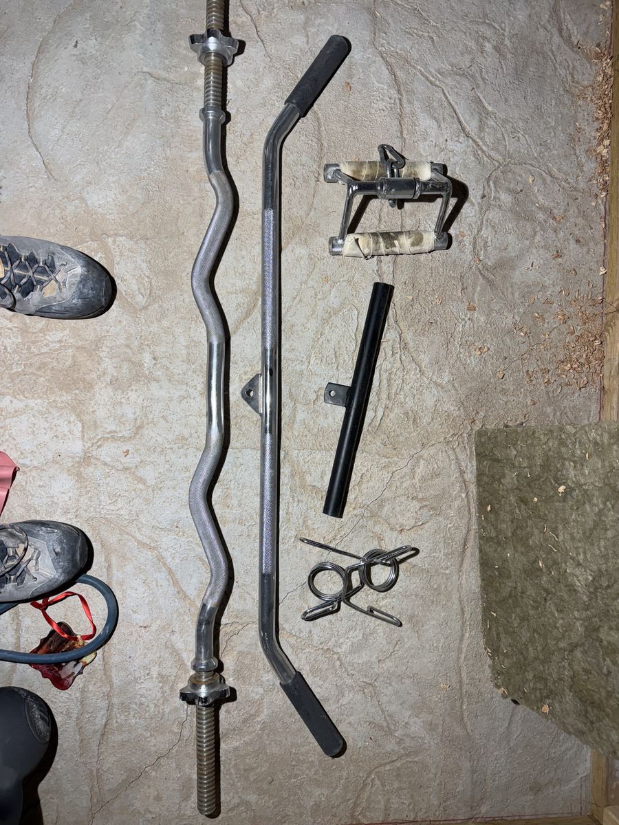 Great home setup! Comes with bench regular bar plates and a few attachments for the pulleys.