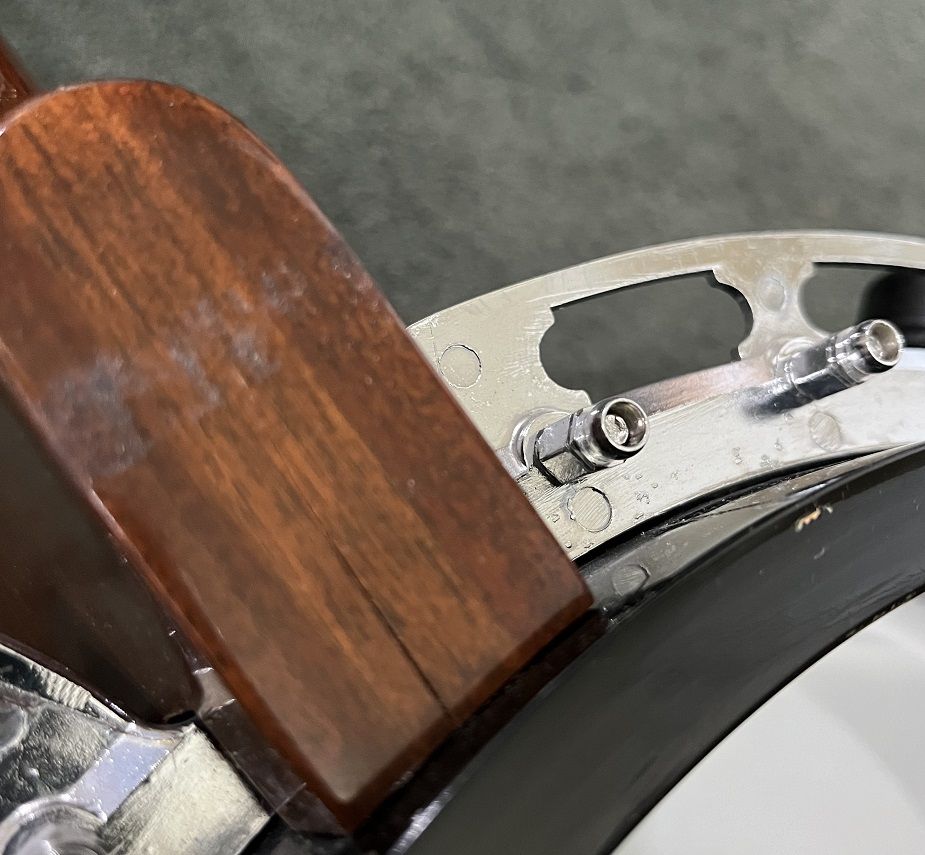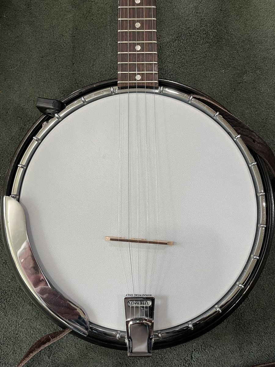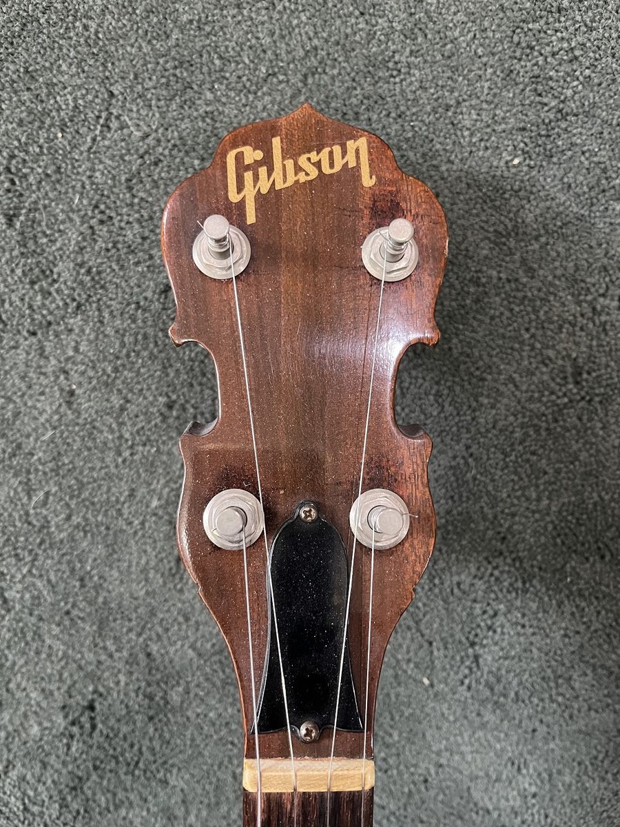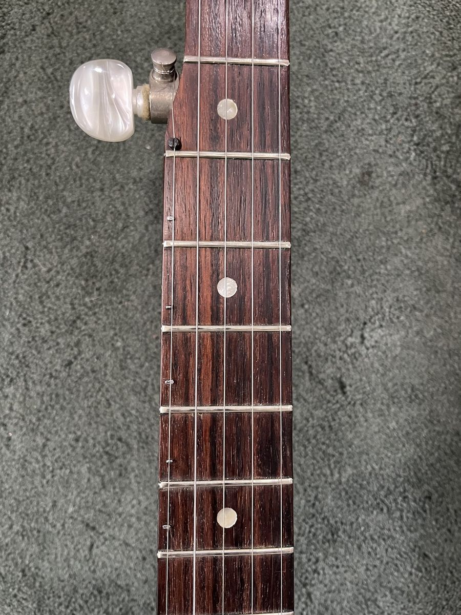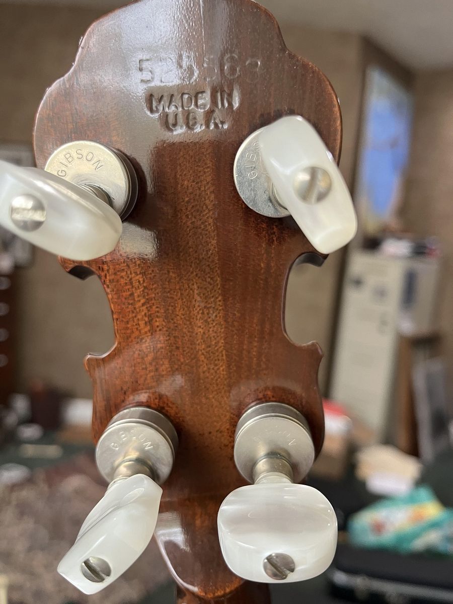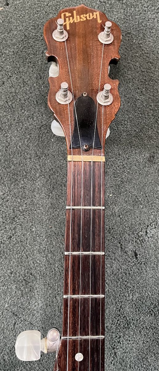 Gibson RB-100 banjo, S/N 525563, 1975. Like a Gibson Mastertone (one piece flange, dual coordinator rods) but with rolled brass tone hoop instead of heavy tone ring. THE GOOD: Fun to play. Crisp attack. Can be very loud when you want it. Versatile sound – plunky near the neck, hard and bluegrassy by the bridge. Slender, comfortable neck. Nice rosewood on fingerboard. Decent looking resonator. THE BAD: Although very playable, frets are showing their age and might not support another crown / polish. THE UGLY: About a one-inch crack on bottom of heel – see photo. Might be just the surface finish or might be the wood– a pro would remove the neck to assess but I am letting sleeping necks lie – have played this banjo regularly for a couple of years and it seems stable. MISC: Spikes on 5th string at frets 6, 7, 8, 9, and 10. Slightly banged up but sturdy hard case. Leather strap in photos NOT included. BOTTOM LINE: A diamond in the rough. Serious inquiries only, please - message if you are interested. $800, cash only (my local police department has a handy Safe Exchange Zone where we can meet).