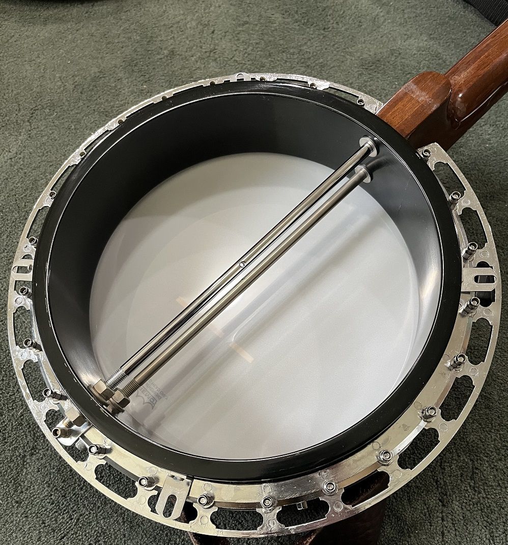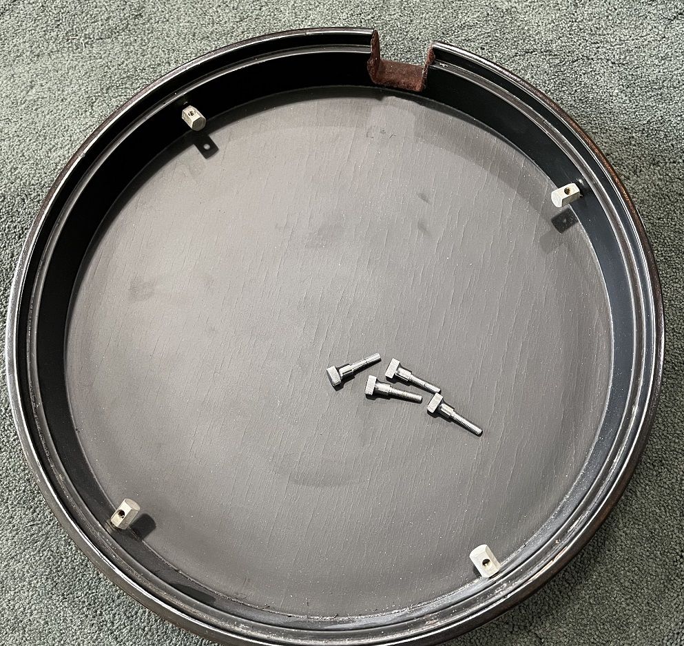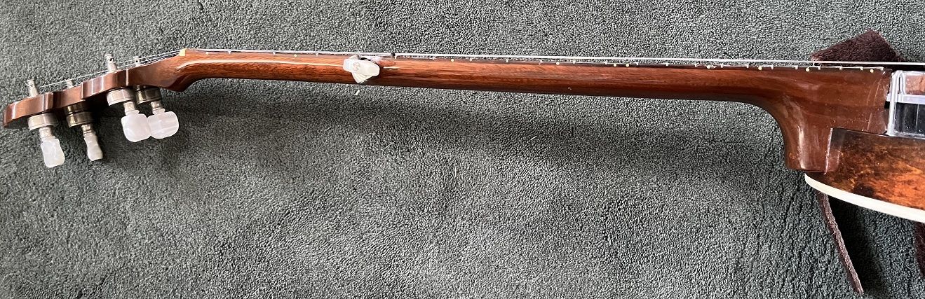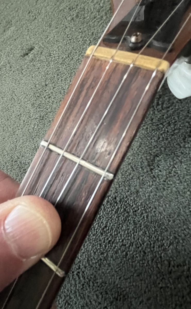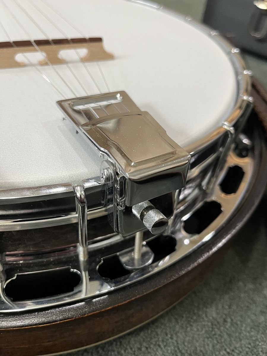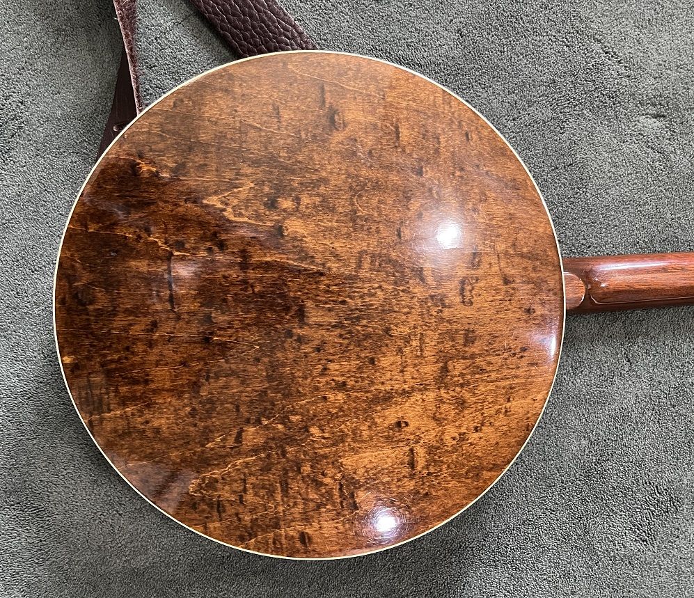 Gibson RB-100 banjo, S/N 525563, 1975. Like a Gibson Mastertone (one piece flange, dual coordinator rods) but with rolled brass tone hoop instead of heavy tone ring. THE GOOD: Fun to play. Crisp attack. Can be very loud when you want it. Versatile sound – plunky near the neck, hard and bluegrassy by the bridge. Slender, comfortable neck. Nice rosewood on fingerboard. Decent looking resonator. THE BAD: Although very playable, frets are showing their age and might not support another crown / polish. THE UGLY: About a one-inch crack on bottom of heel – see photo. Might be just the surface finish or might be the wood– a pro would remove the neck to assess but I am letting sleeping necks lie – have played this banjo regularly for a couple of years and it seems stable. MISC: Spikes on 5th string at frets 6, 7, 8, 9, and 10. Slightly banged up but sturdy hard case. Leather strap in photos NOT included. BOTTOM LINE: A diamond in the rough. Serious inquiries only, please - message if you are interested. $800, cash only (my local police department has a handy Safe Exchange Zone where we can meet).