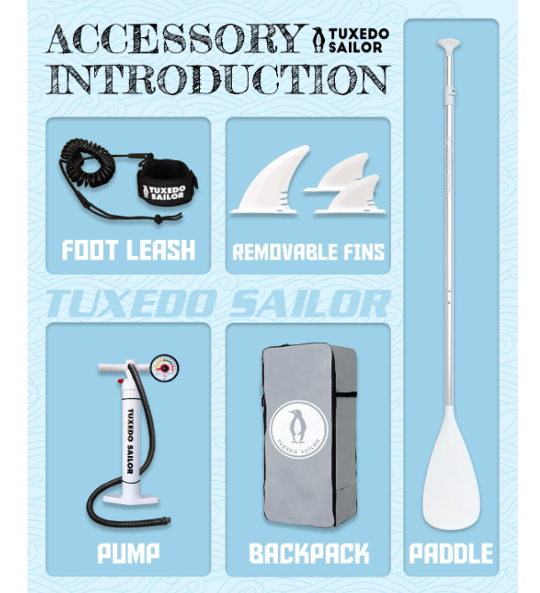 Intimate DesignThe non-slip EVA deck pad in the middle allows enough friction while standing on the paddle board. The 3-fin is designed for acceleration, the bottom center fin is used for increasing stability and makes the steering more flexible. The fins can be easily removed when storing the paddle board. While on the water, you can attach the pack to the paddle board.