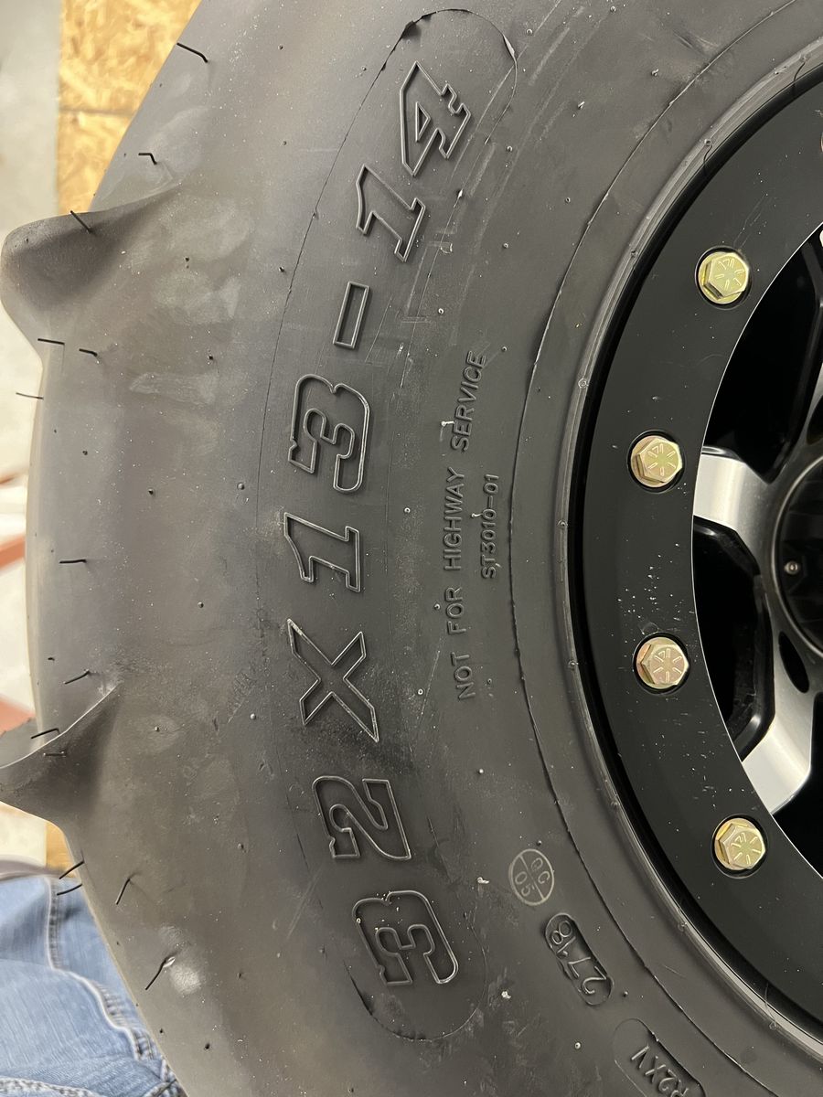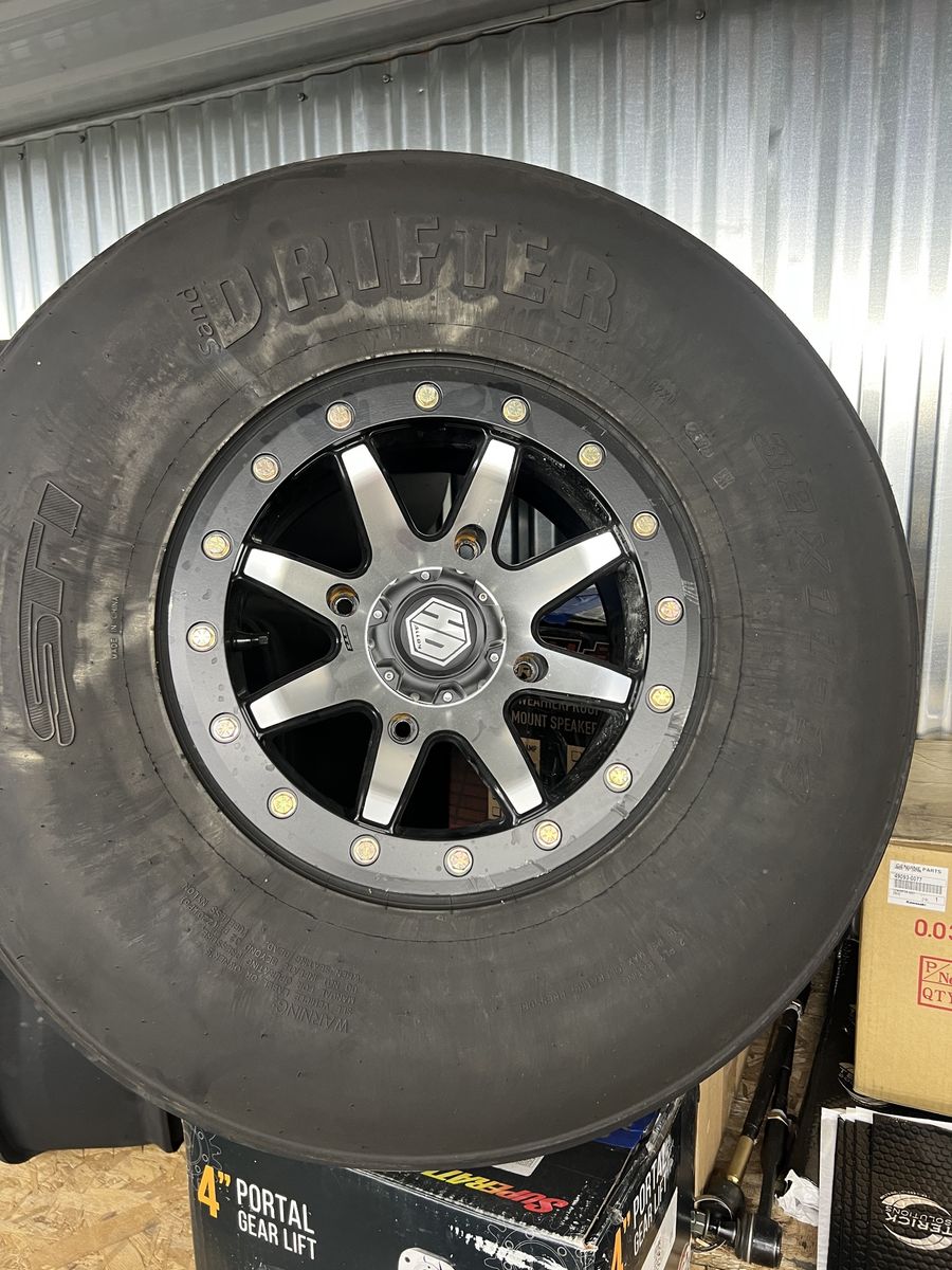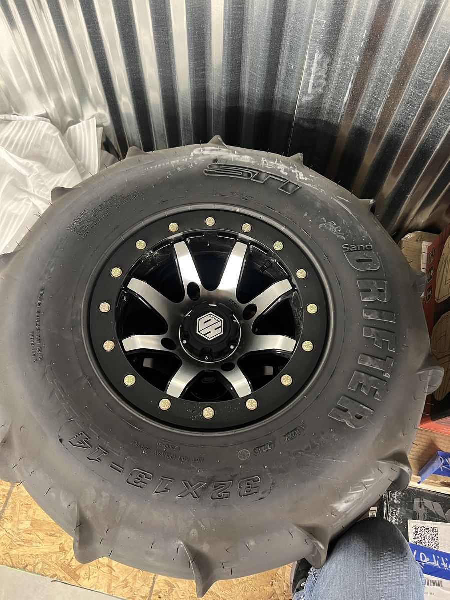 -Fronts are the STI sand drifter 32x11R14 3 rib design. -Rears are the STI sand drifter 32x13R14 14 paddle -wheels are the STI Machined HD9 Comp Lock Beadlock Wheels in the 4/156 light pattern. Fronts are 8” and rears are 10” wide. Wheels have a few minimal scratches on the beadlocks but overall great shape.