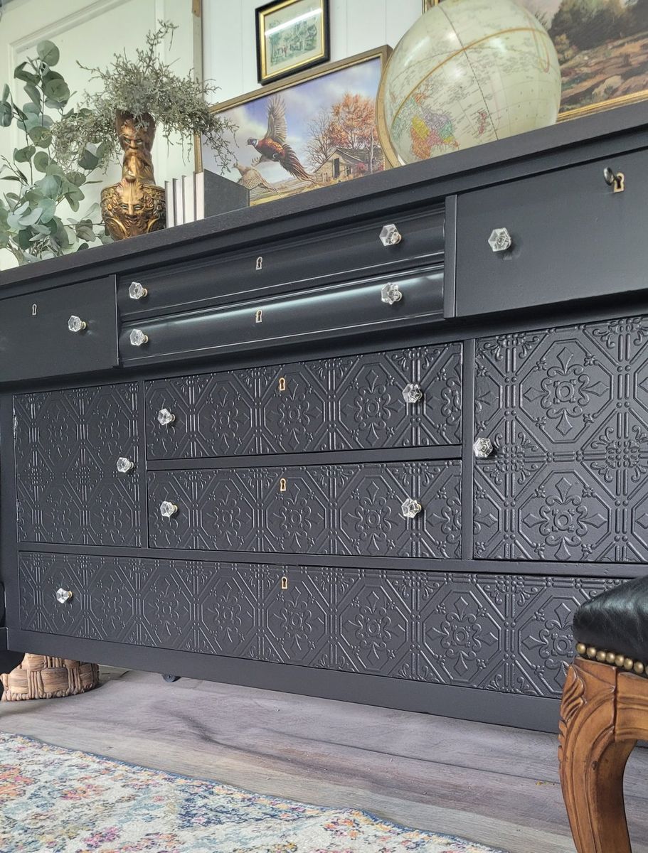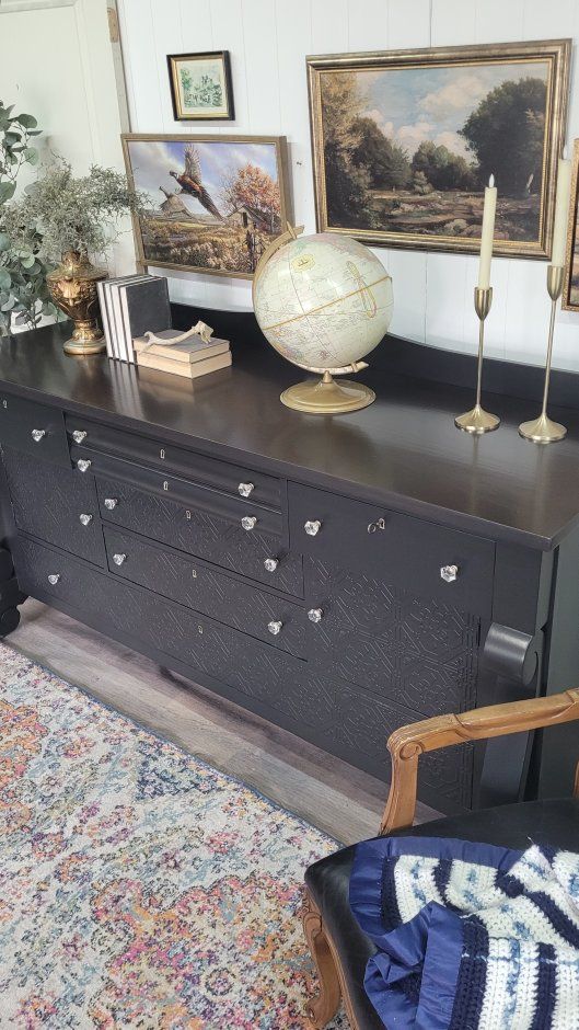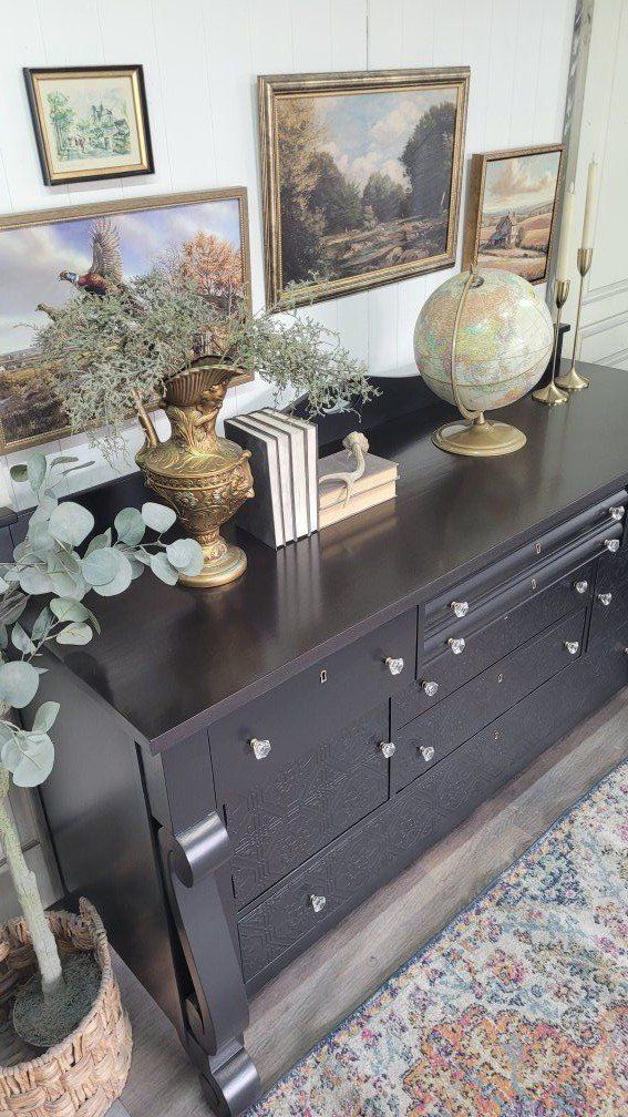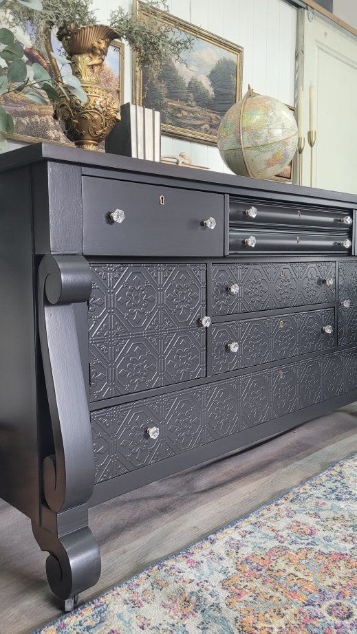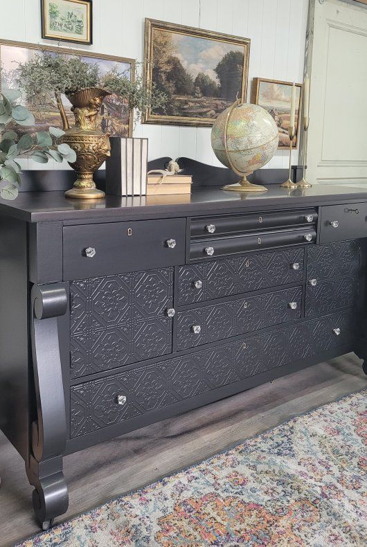 Look at the gorgeous lines on this solid wood antique empire buffet from thr early 1900s I finished this in a gorgeous satin black with a dark espresso stained top Raised detailed, paintable wallpaper was added to the lower area to give the flat front more presence. All the drawers and doors work as they should. They all have crystal knobs and even have the original key for all of the drawer locks. 72L x 25d at the bottom curve of the leg x 38h plus 5.5" added for the backsplash area Delivery is available for a fee Follow me at facebook.com/sweetblossomchic or Instagram.com/sweetblossomchic for updates on new pieces and more unique furniture and decor.
